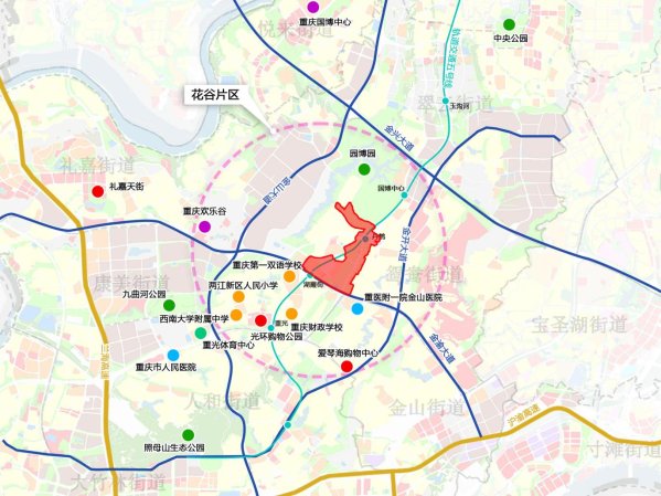 重庆园博园花谷片区是两江新区高品质宜居宜业宜游核心区。花谷片区“公园+”项目位于片区内,北靠园博园,西接龙景湖,东邻规划主干路,南接金渝大道,分别距江北国际机场和重庆北站约10公里,距金州商圈(光环购物公园、金科悦FUN等)约2.5公里。现状轨道交通5号线从规划区穿过,分别在东北和西南两侧设置丹鹤站和湖霞街站两个轨道站点。