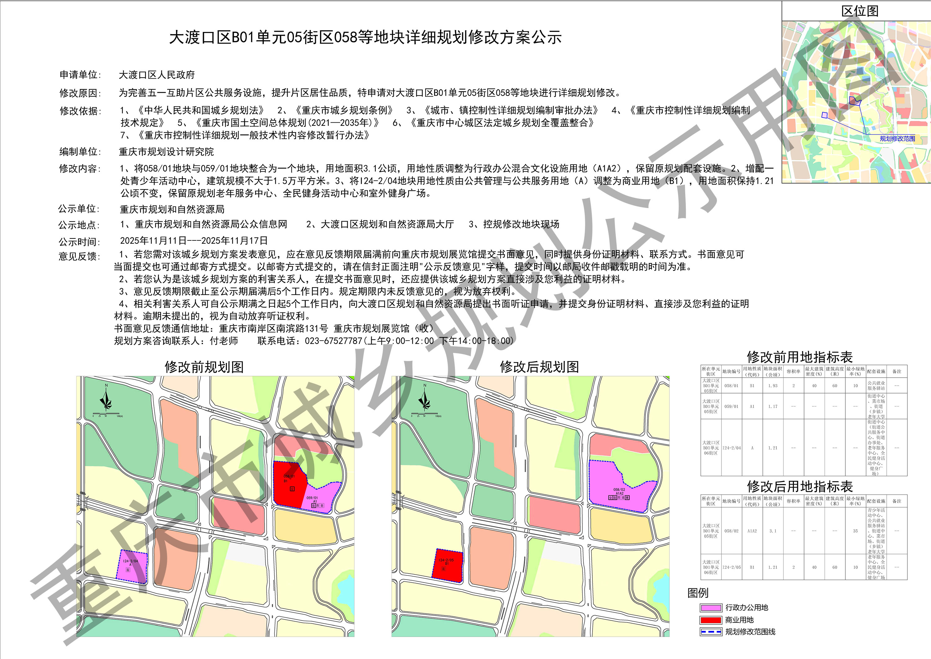 大渡口区B01单元05街区058等地块详细规划修改方案公示