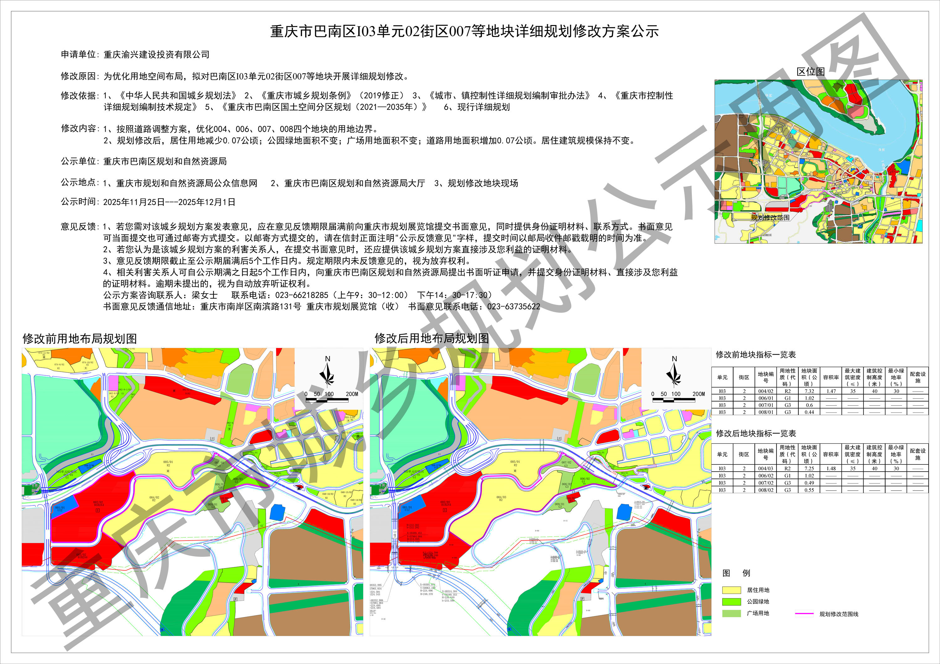重庆市巴南区I03单元02街区007等地块详细规划修改方案公示