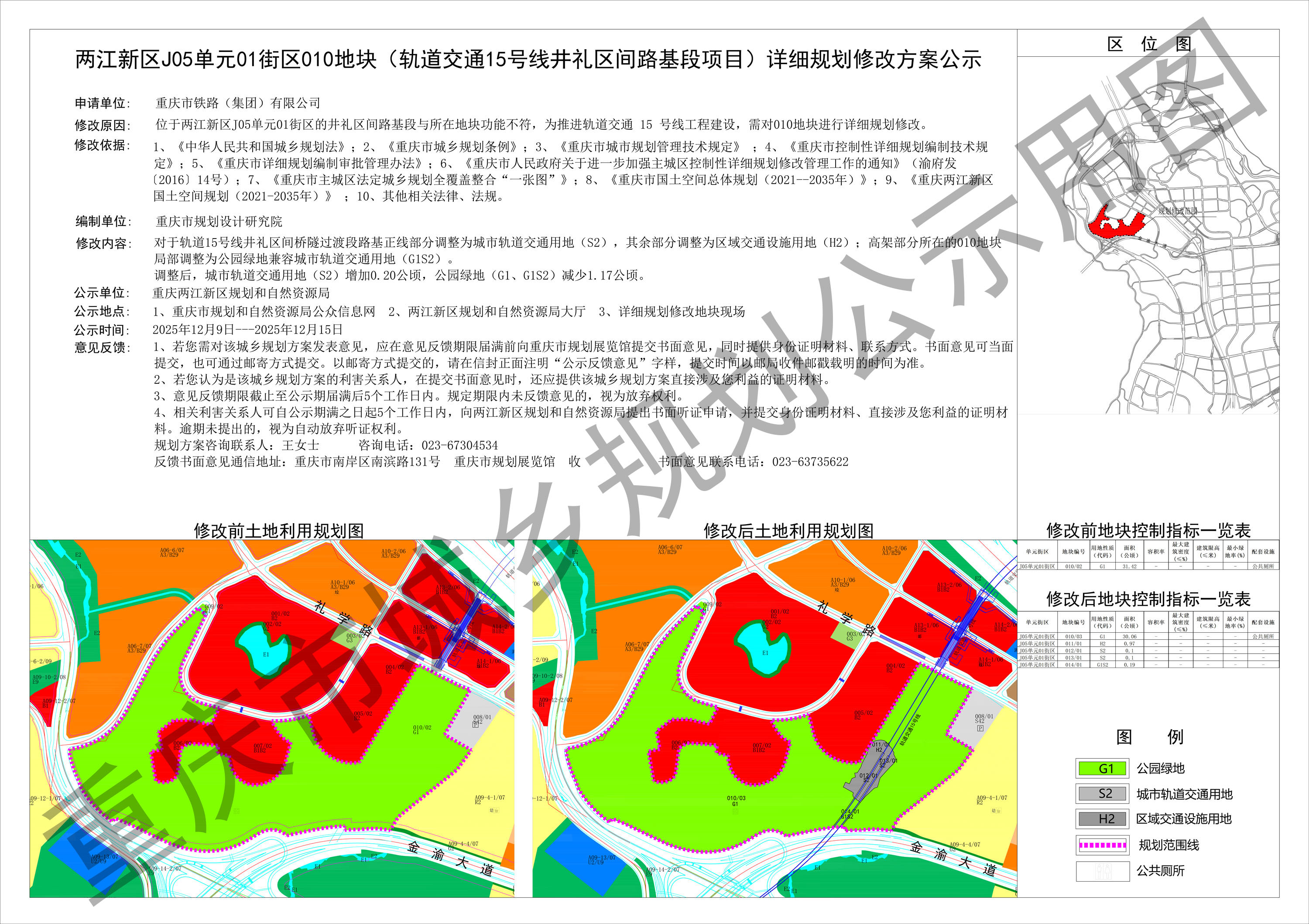 两江新区J05单元01街区010地块(轨道交通15号线井礼区间路基段项目)详细规划修改方案公示