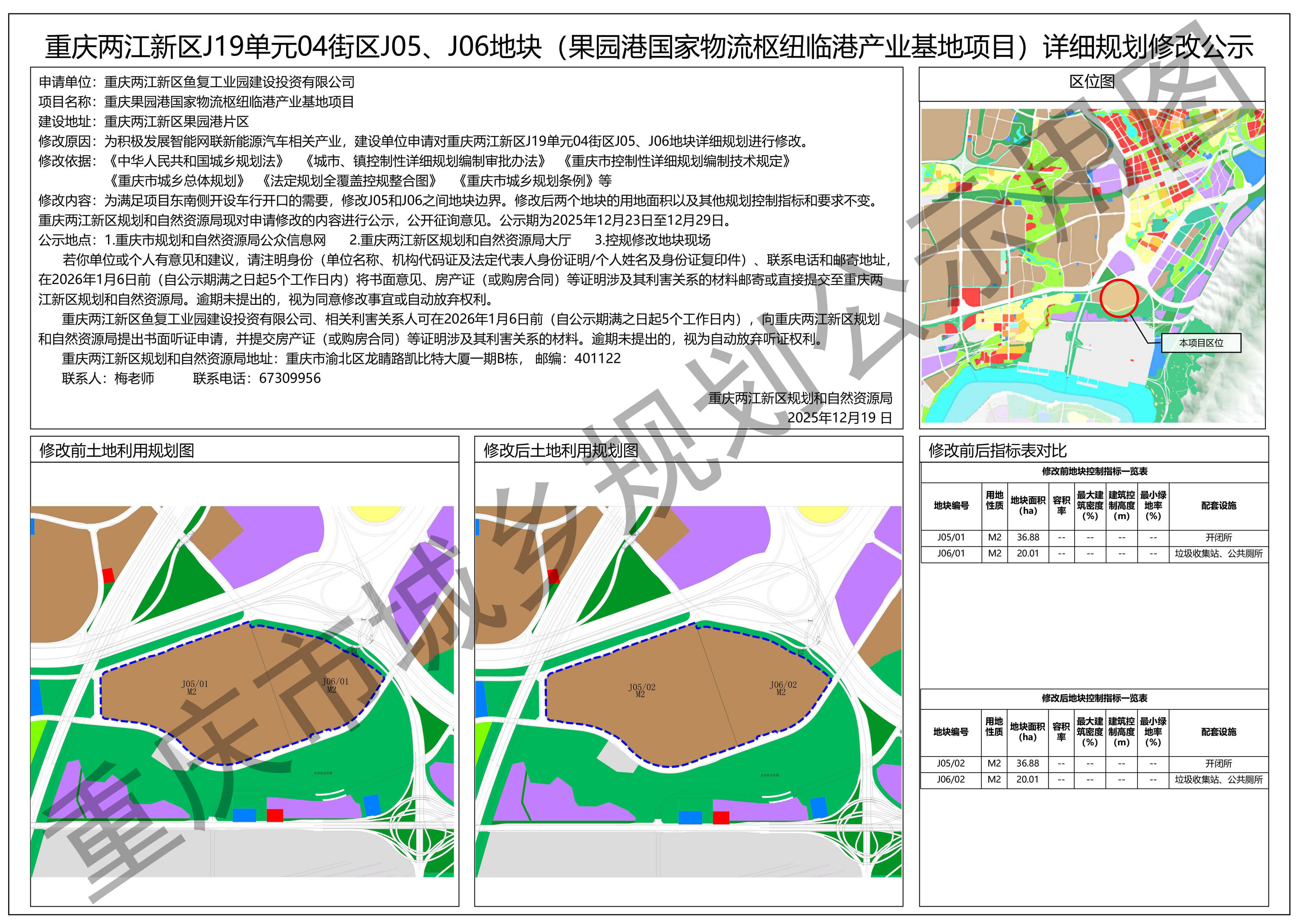 重庆两江新区J19单元04街区J05、J06地块(果园港国家物流枢纽临港产业基地项目)详细规划修改公示