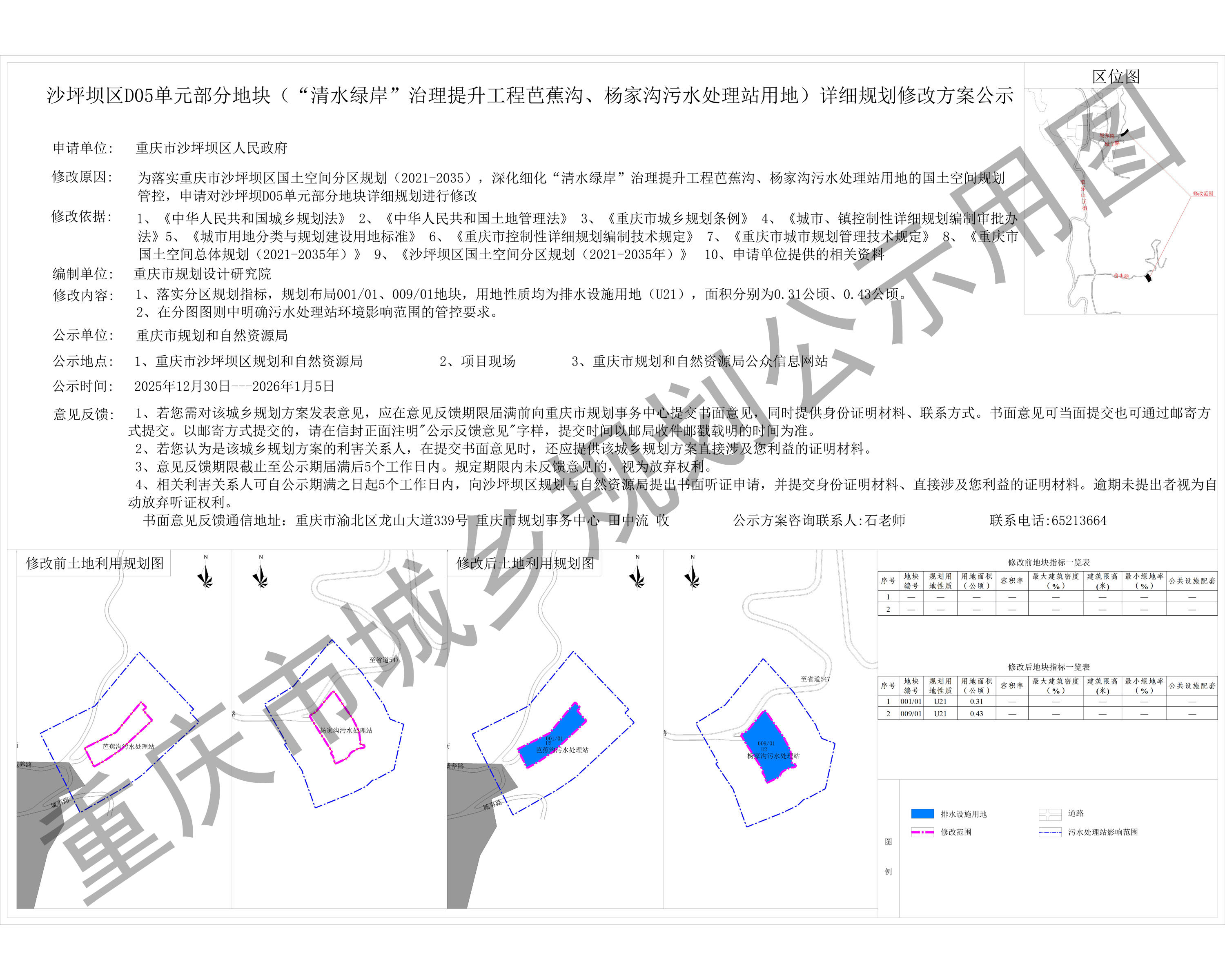 沙坪坝区D05单元部分地块(“清水绿岸”治理提升工程芭蕉沟、杨家沟污水处理站用地)详细规划修改方案公示