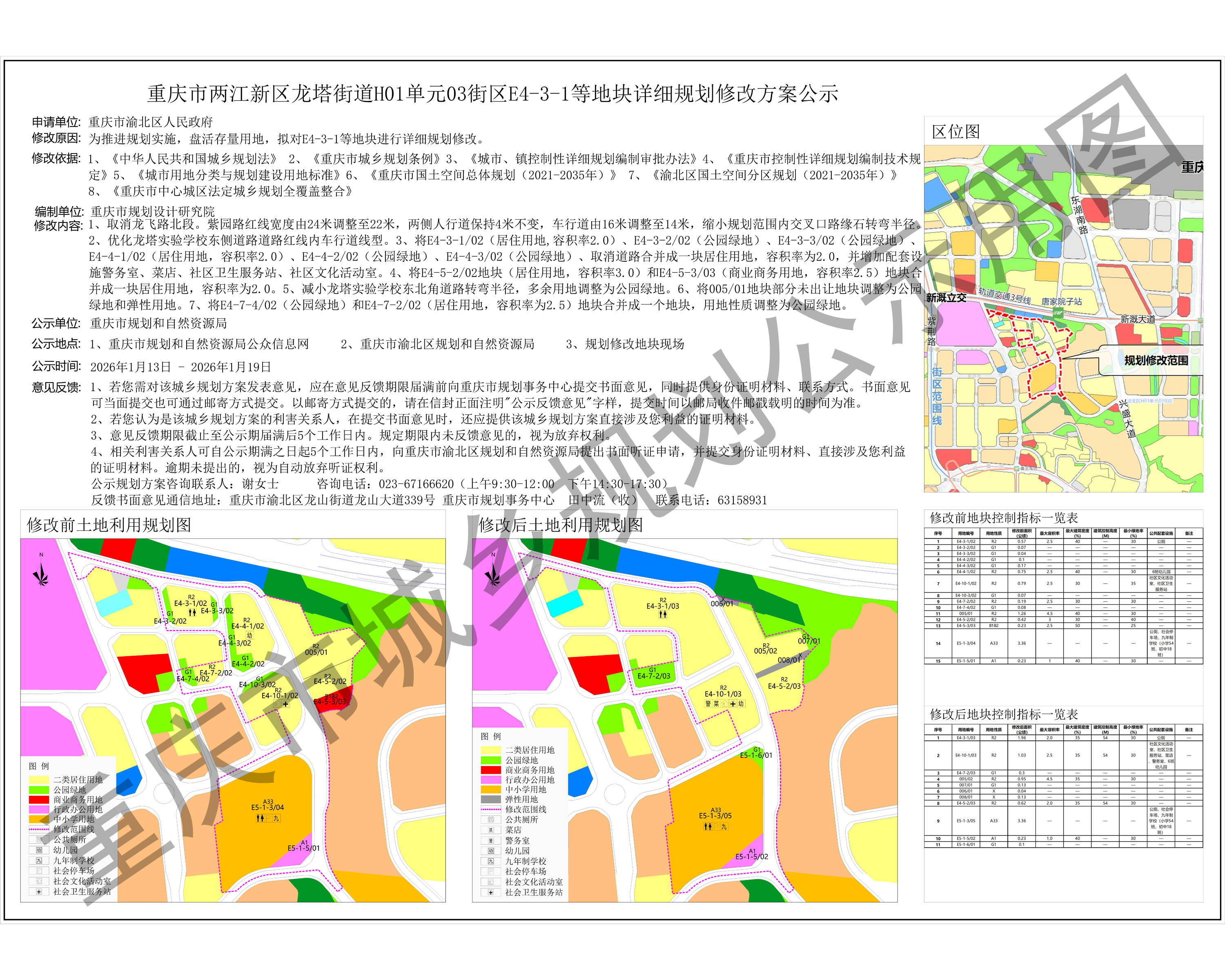 重庆市两江新区龙塔街道H01单元03街区E4-3-1等地块详细规划修改方案公示