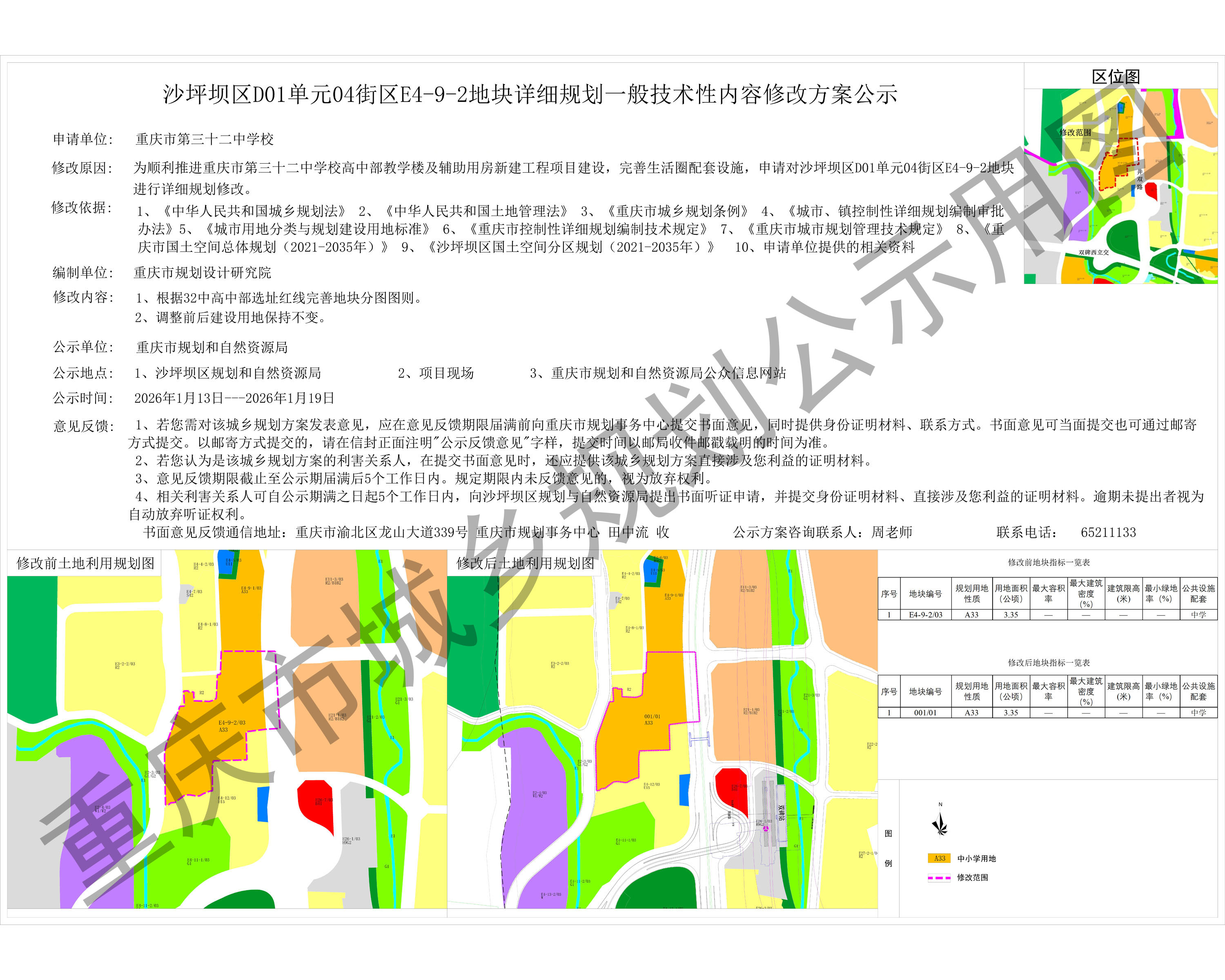 沙坪坝区D01单元04街区E4-9-2地块详细规划一般技术性内容修改方案公示