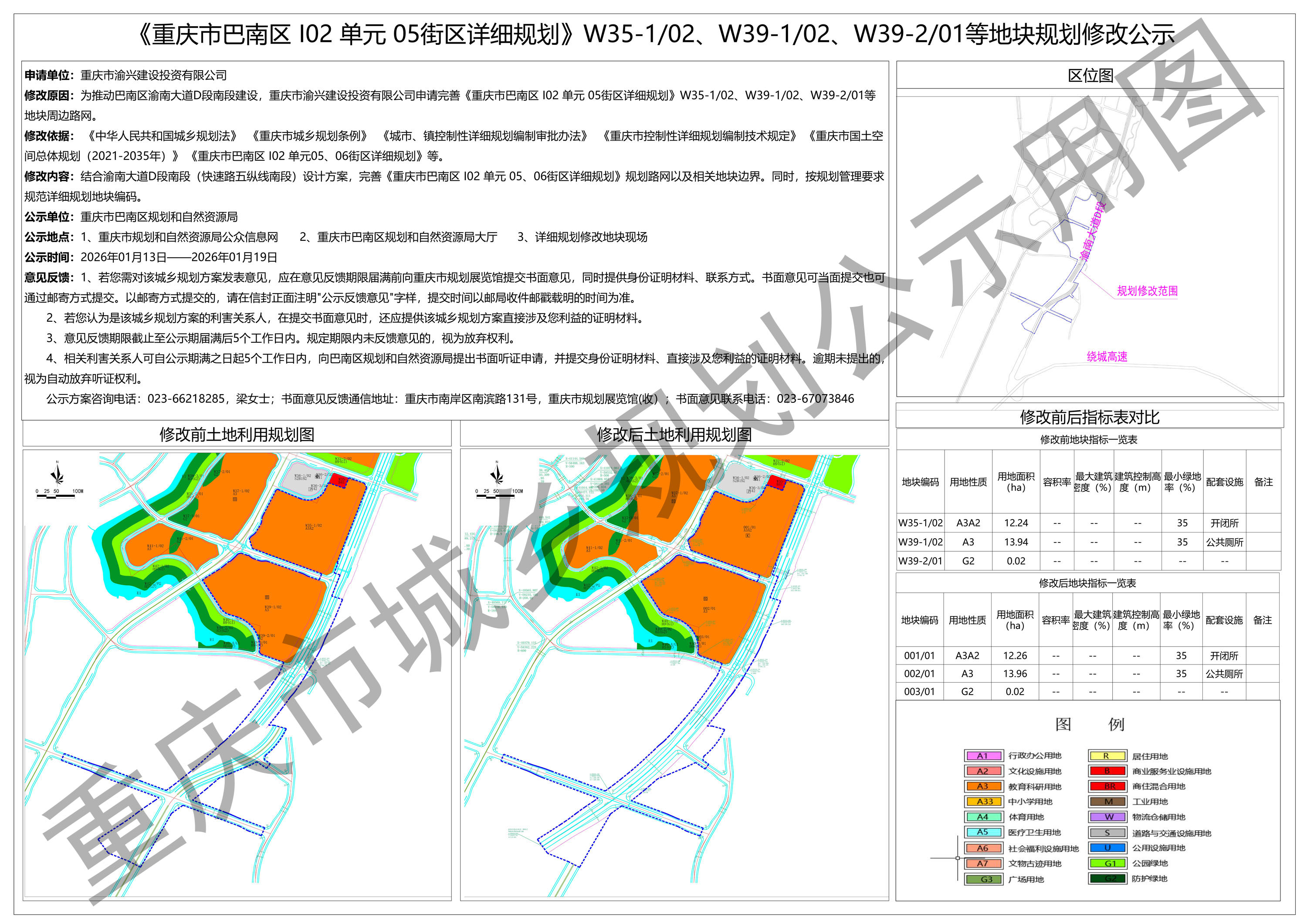 《重庆市巴南区I02单元05街区详细规划》W35-1/02、W39-1/02、W39-2/01等地块规划修改公示
