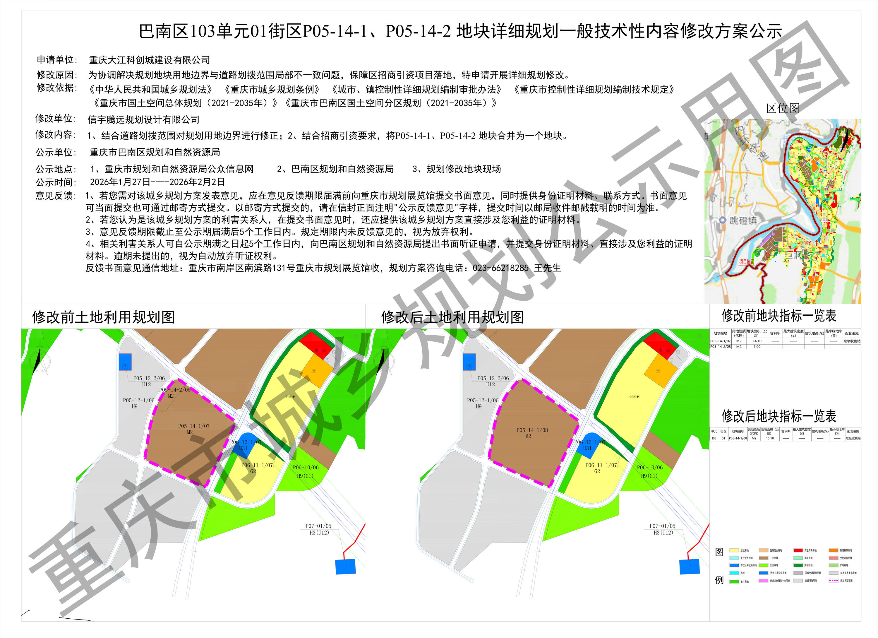 巴南区103单元01街区P05-14-1、P05-14-2地块详细规划一般技术性内容修改方案公示