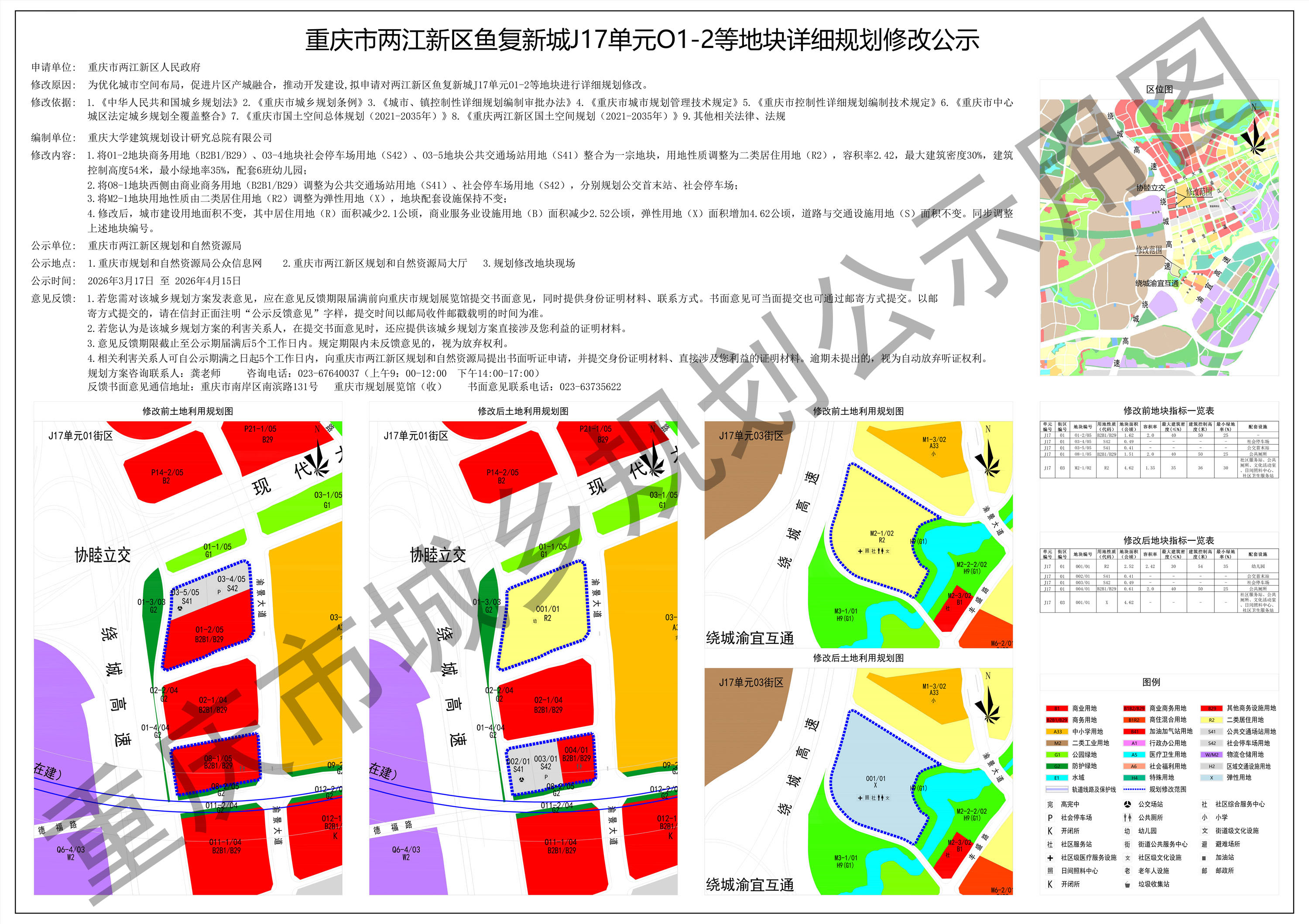 重庆市两江新区鱼复新城J17单元O1-2等地块详细规划修改公示