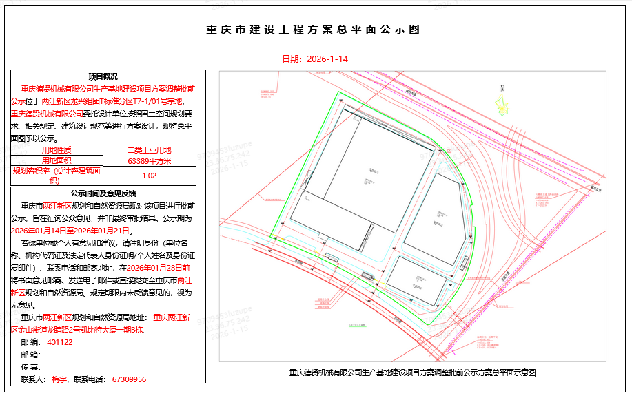 重庆德贤机械有限公司生产基地建设项目方案调整批前公示