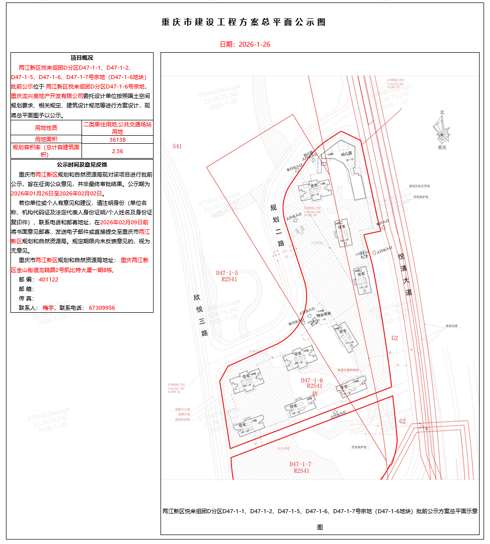 两江新区悦来组团D分区D47-1-1、D47-1-2、D47-1-5、D47-1-6、D47-1-7号宗地(D47-1-6地块)批前公示
