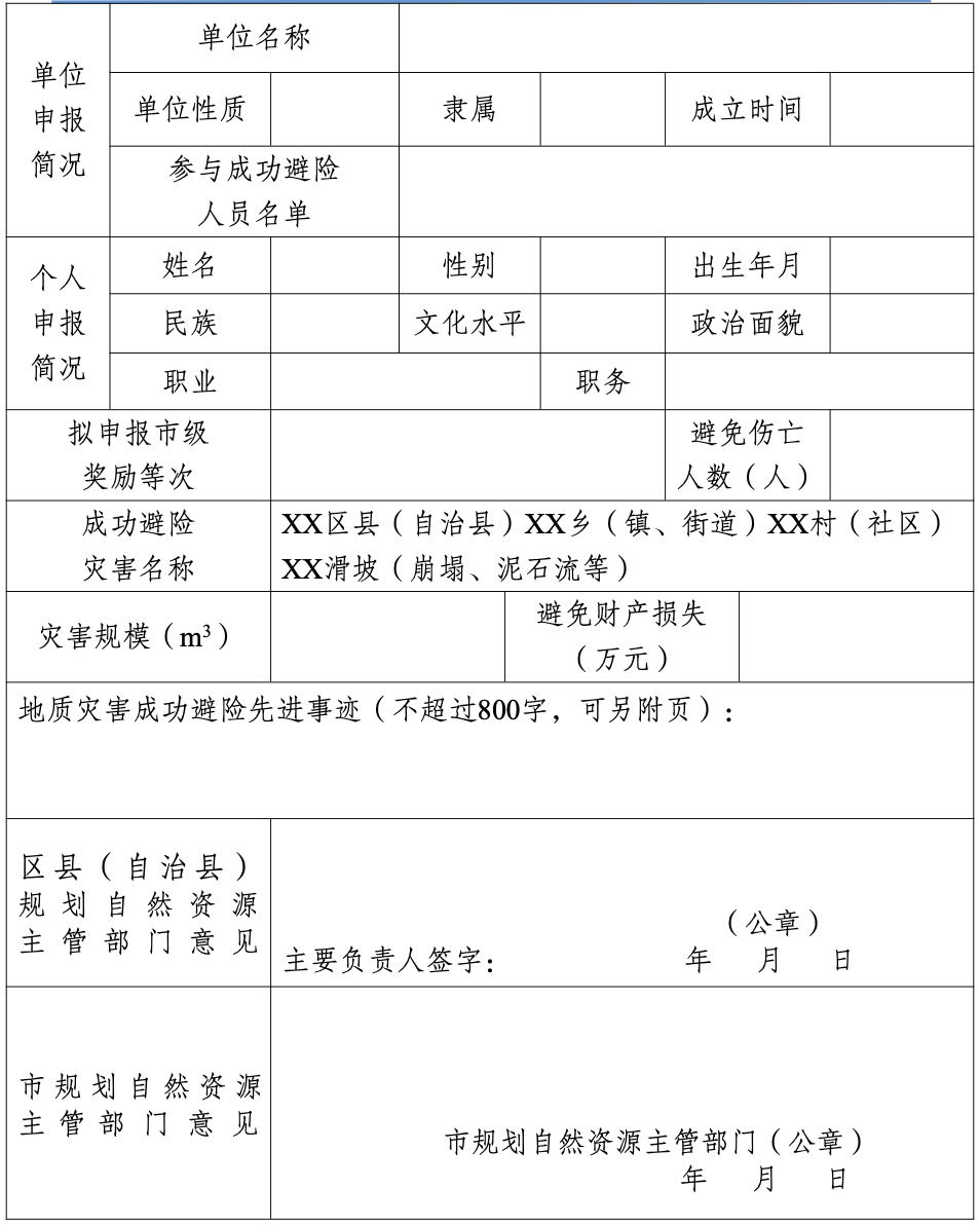 附件:1.重庆市地质灾害成功避险奖励申报表