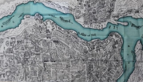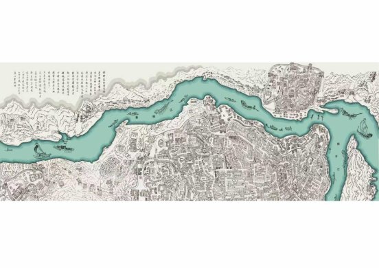 围巾以晚清重庆本土实业家刘子如绘制的传世珍图《增广重庆地舆全图》为核心灵感,精准提取古地图中渝中半岛街巷肌理、两江汇流及朝天门、通远门等城市地标,以线条勾勒城市骨架,凝练呈现重庆从内陆古城向近代商埠转型的历史印记。作品在色彩上选取青绿色系搭配米白底色,还原山城青石板、两江碧水的地域特色,兼顾复古质感与审美表达。