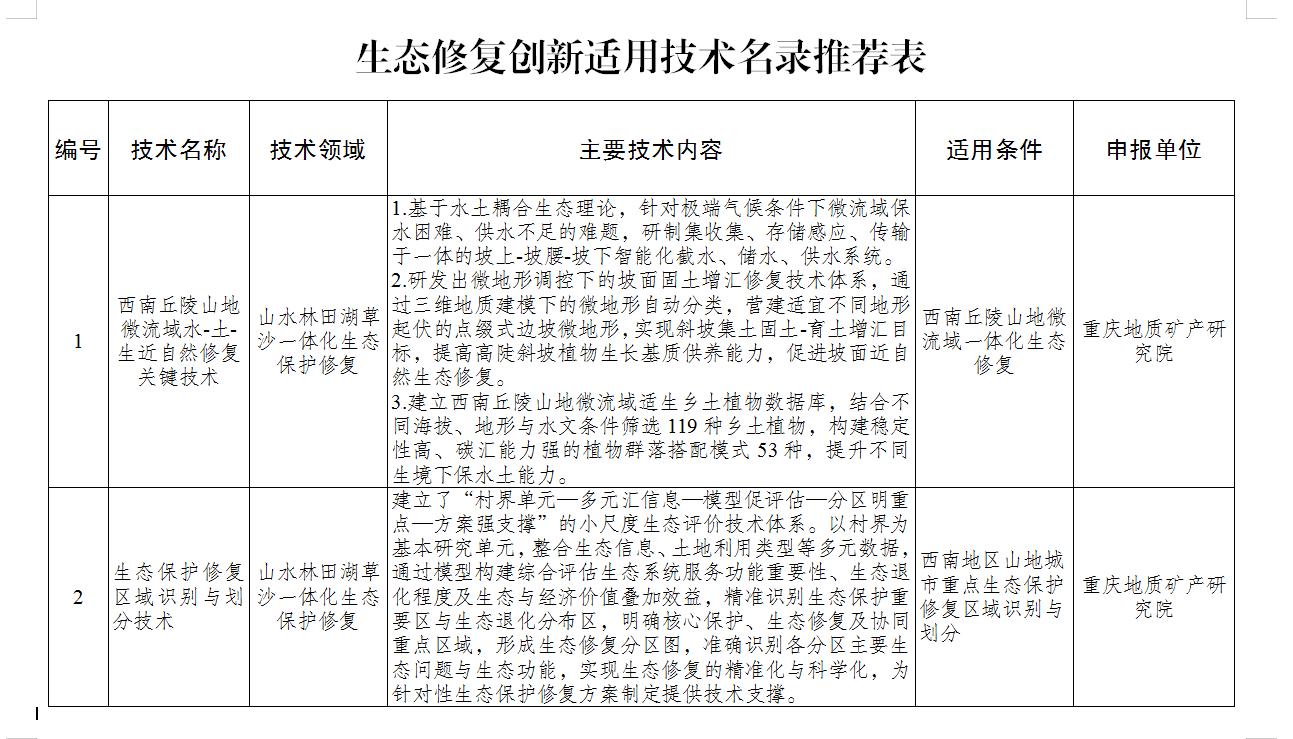 根据《自然资源部办公厅 国家林业和草原局办公室 中国地质调查局办公室 关于开展生态修复创新适用技术名录征集推荐工作的通知》(自然资办函〔2025〕2477号)要求,现将我局推荐的2项技术进行公示,公示期为5日。