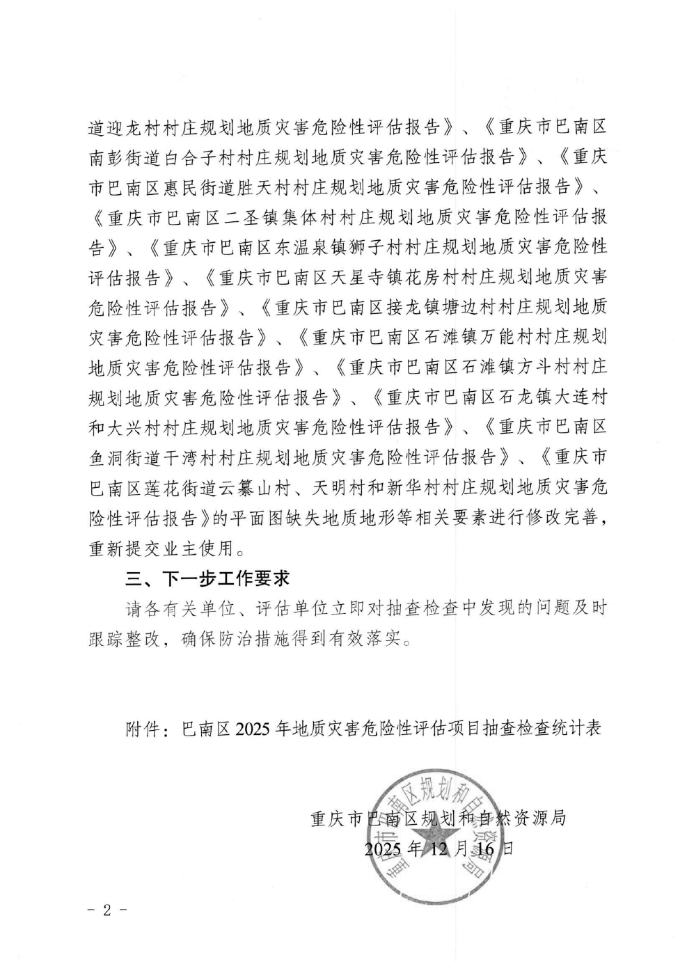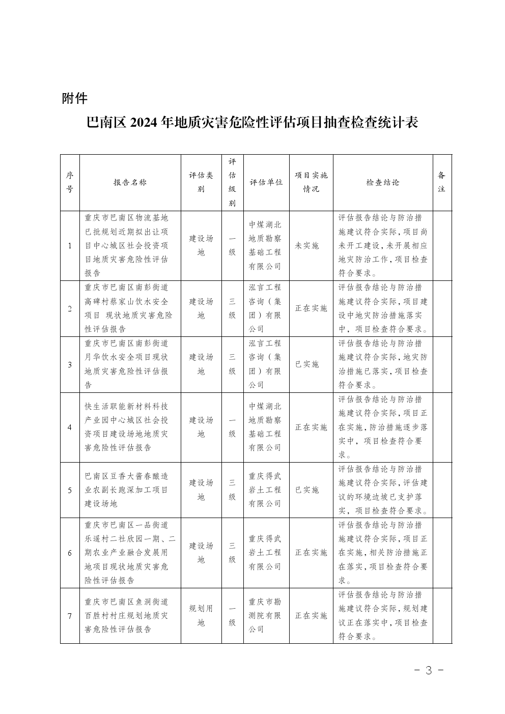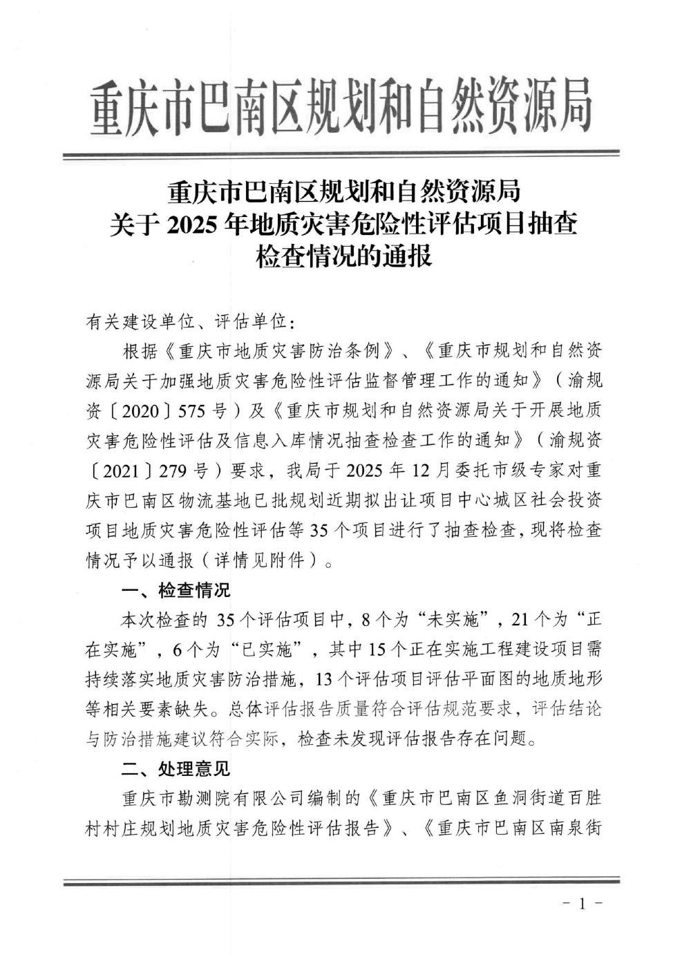 重庆市巴南区规划和自然资源局关于2025年巴南区地质灾害危险性评估项目抽查检查情况的通报