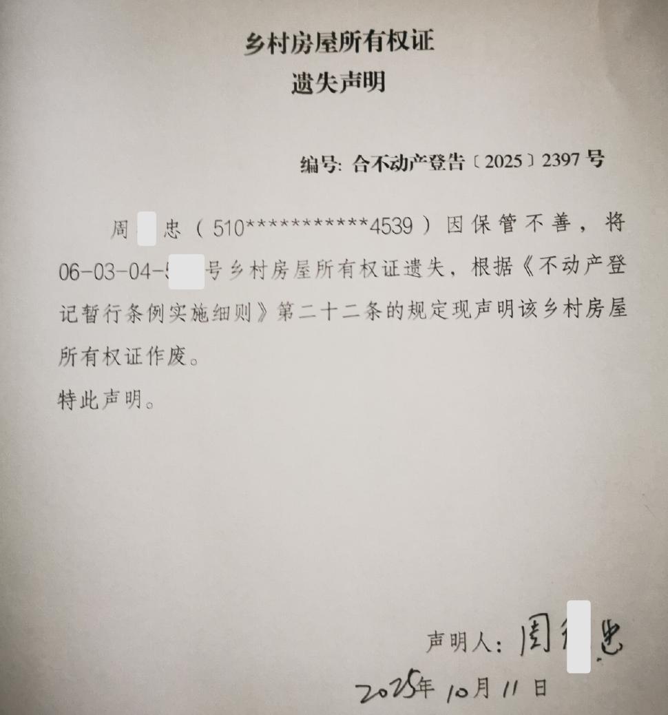 乡村房屋所有权证遗失声明编号:合不动产登告﹝2025﹞2397号
