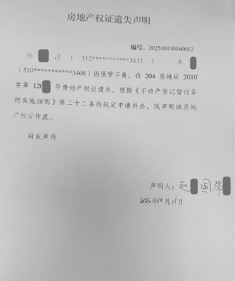 房地产权证遗失声明编号:202510110160012