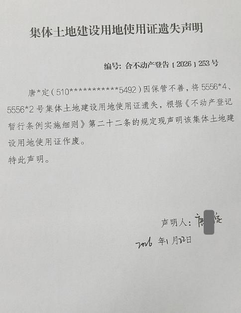 集体土地建设用地使用证遗失声明编号:合不动产登告﹝2026﹞253 号
