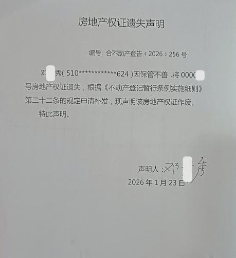 房地产权证遗失声明编号:合不动产登告﹝2026﹞ 256号
