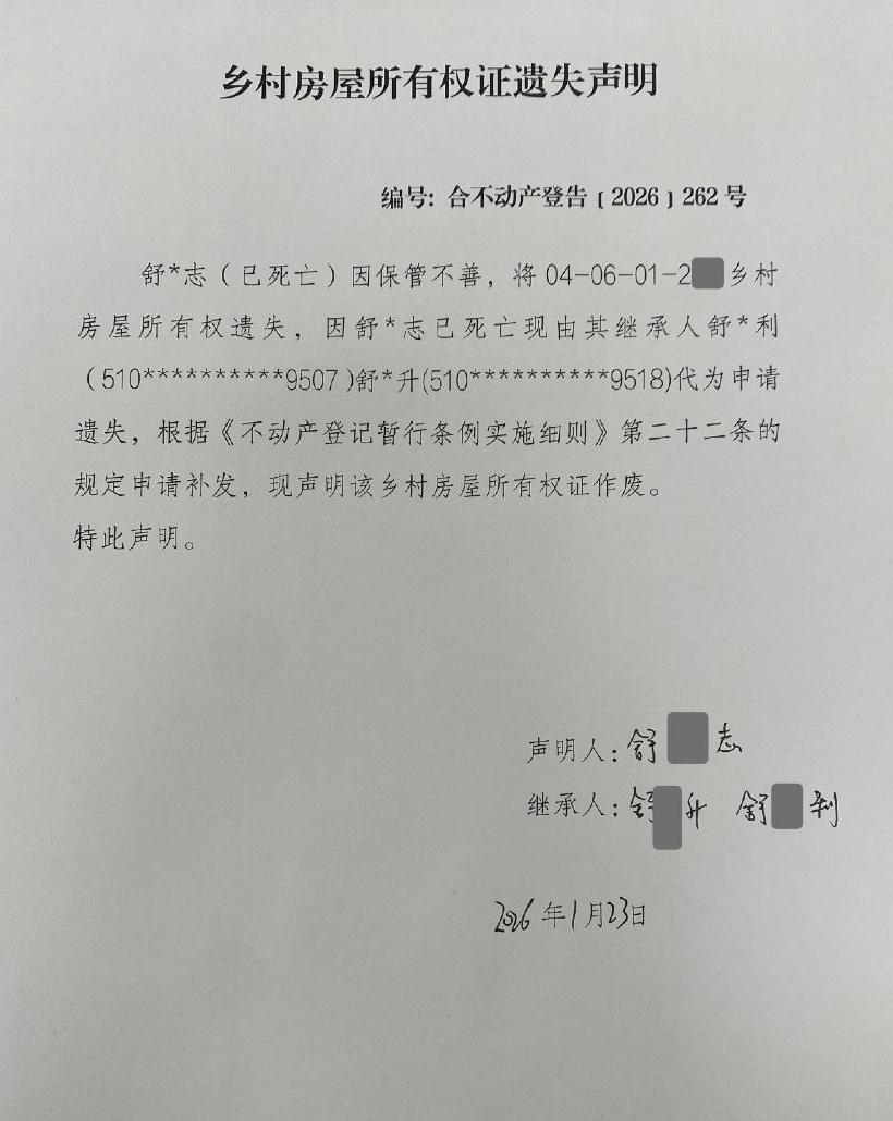 乡村房屋所有权证遗失声明编号:合不动产登告﹝2026﹞262 号