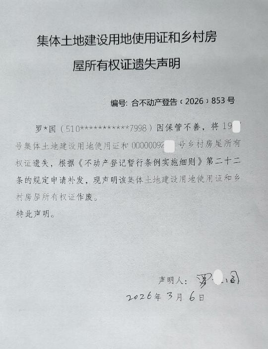 乡村房屋所有权证和集体土地建设用地使用证遗失声明编号:合不动产登告﹝2026﹞853 号