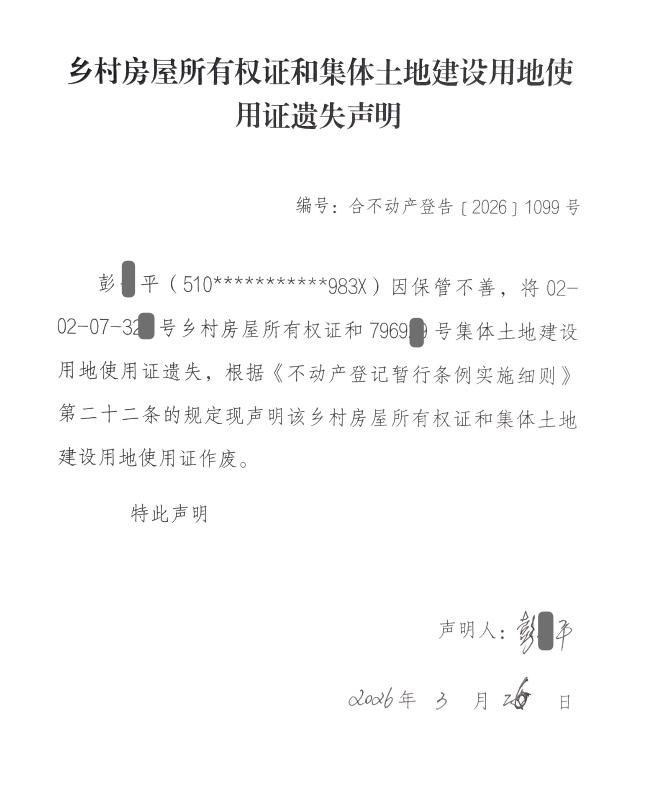 乡村房屋所有权证和集体土地建设用地使用证遗失声明编号:合不动产登告﹝2026﹞1099 号