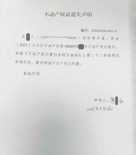 不动产权证遗失声明编号:202603260160110