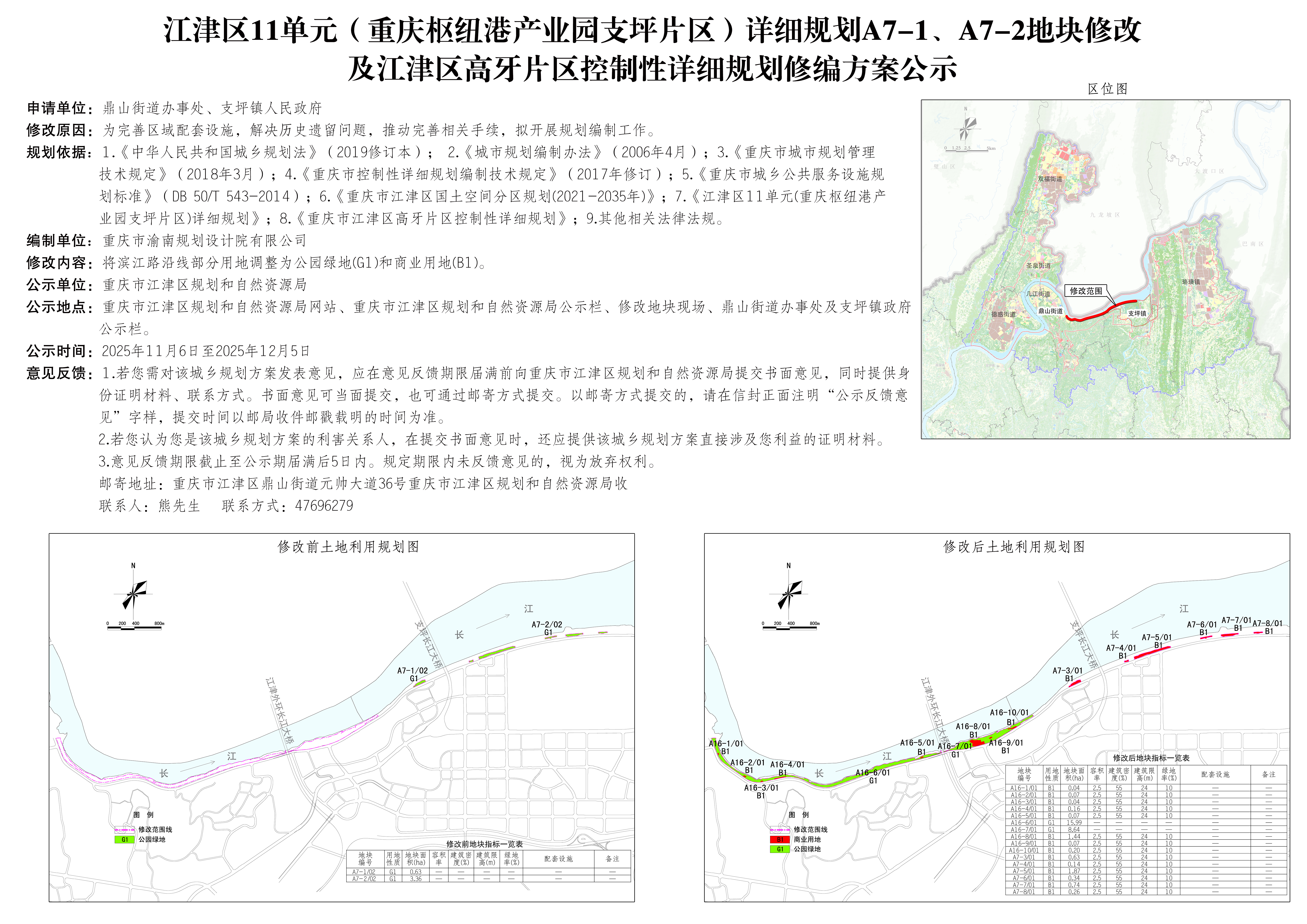 江津区11单元(重庆枢纽港产业园支坪片区)详细规划A7-1、A7-2地块修改及江津区高牙片区控制性详细规划修编方案公示