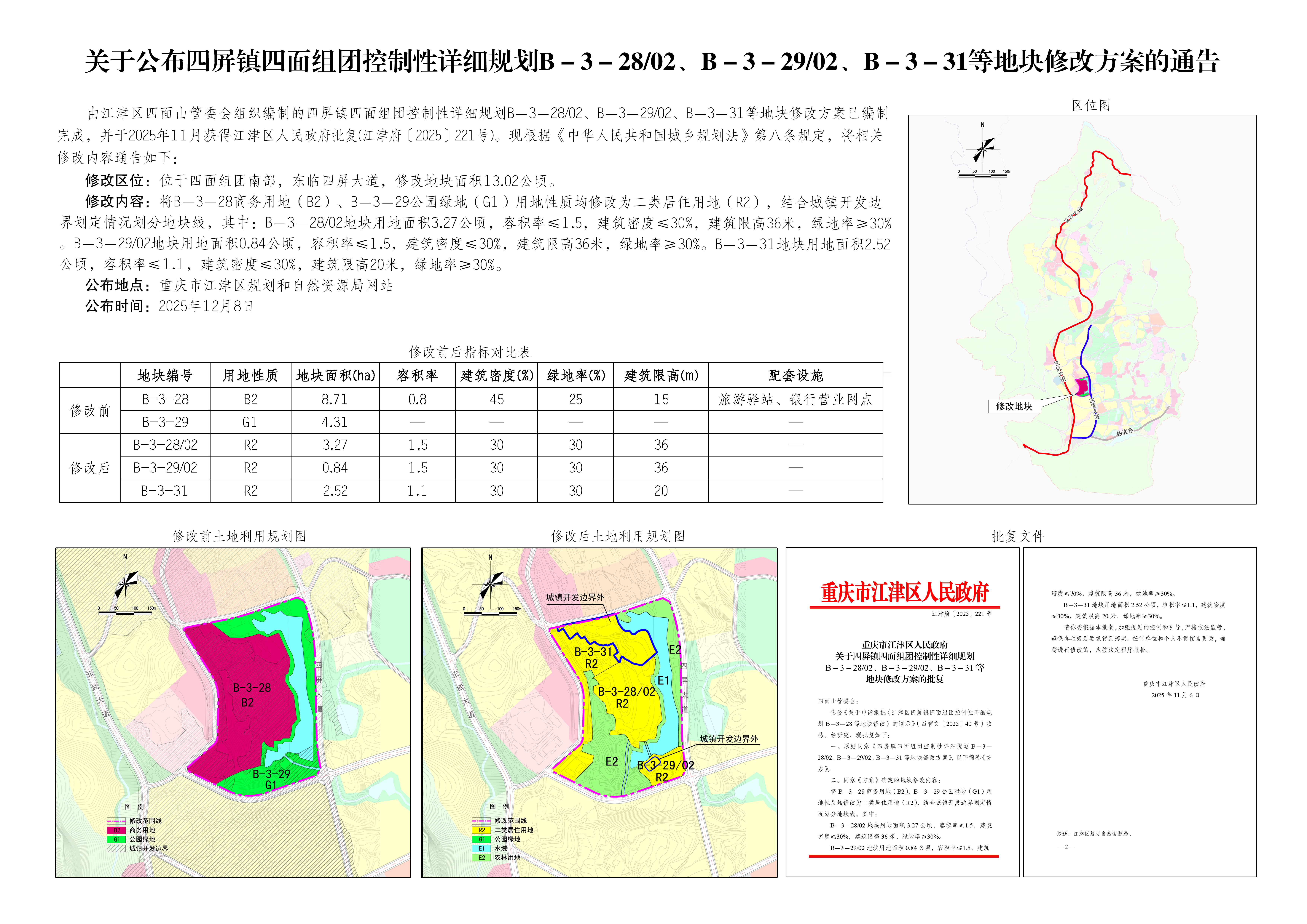 关于公布四屏镇四面组团控制性详细规划B-3-28-02、B-3-29-02、B-3-31等地块修改方案的通告