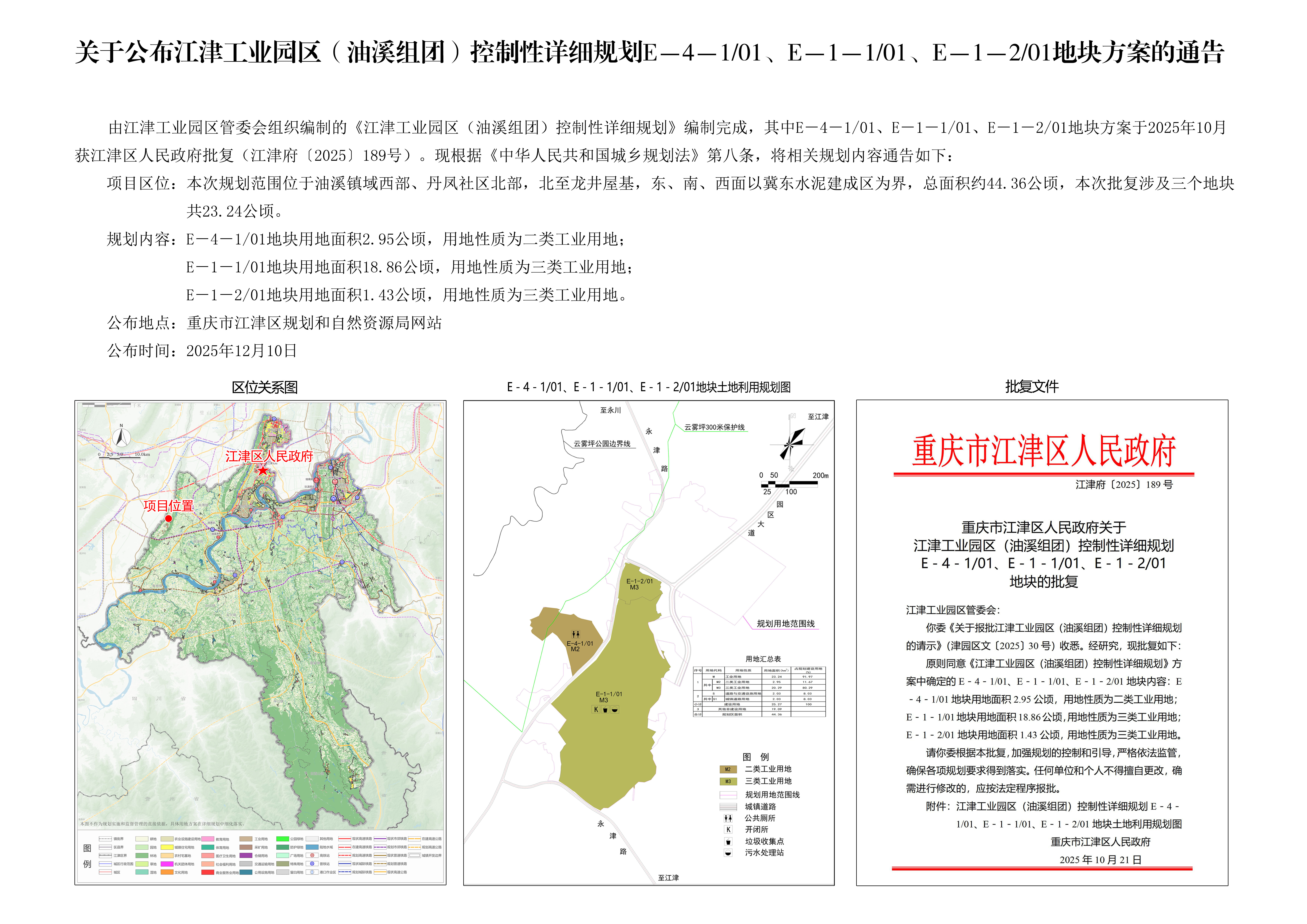 关于公布江津工业园区(油溪组团)控制性详细规划E-4-1-01、E-1-1-01、E-1-2-01地块方案的通告