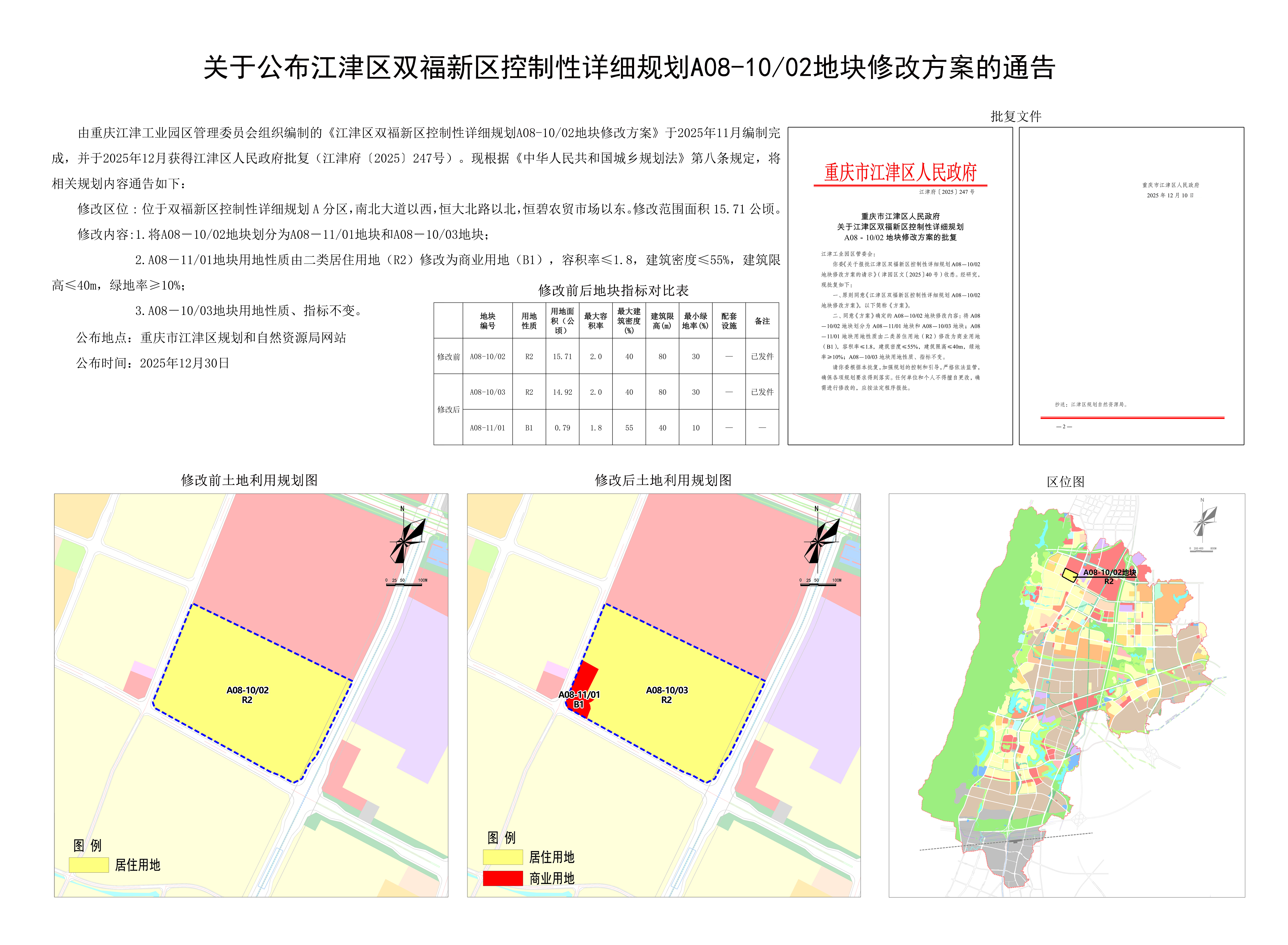 关于公布江津区双福新区控制性详细规划A08-10/02地块修改方案的通告