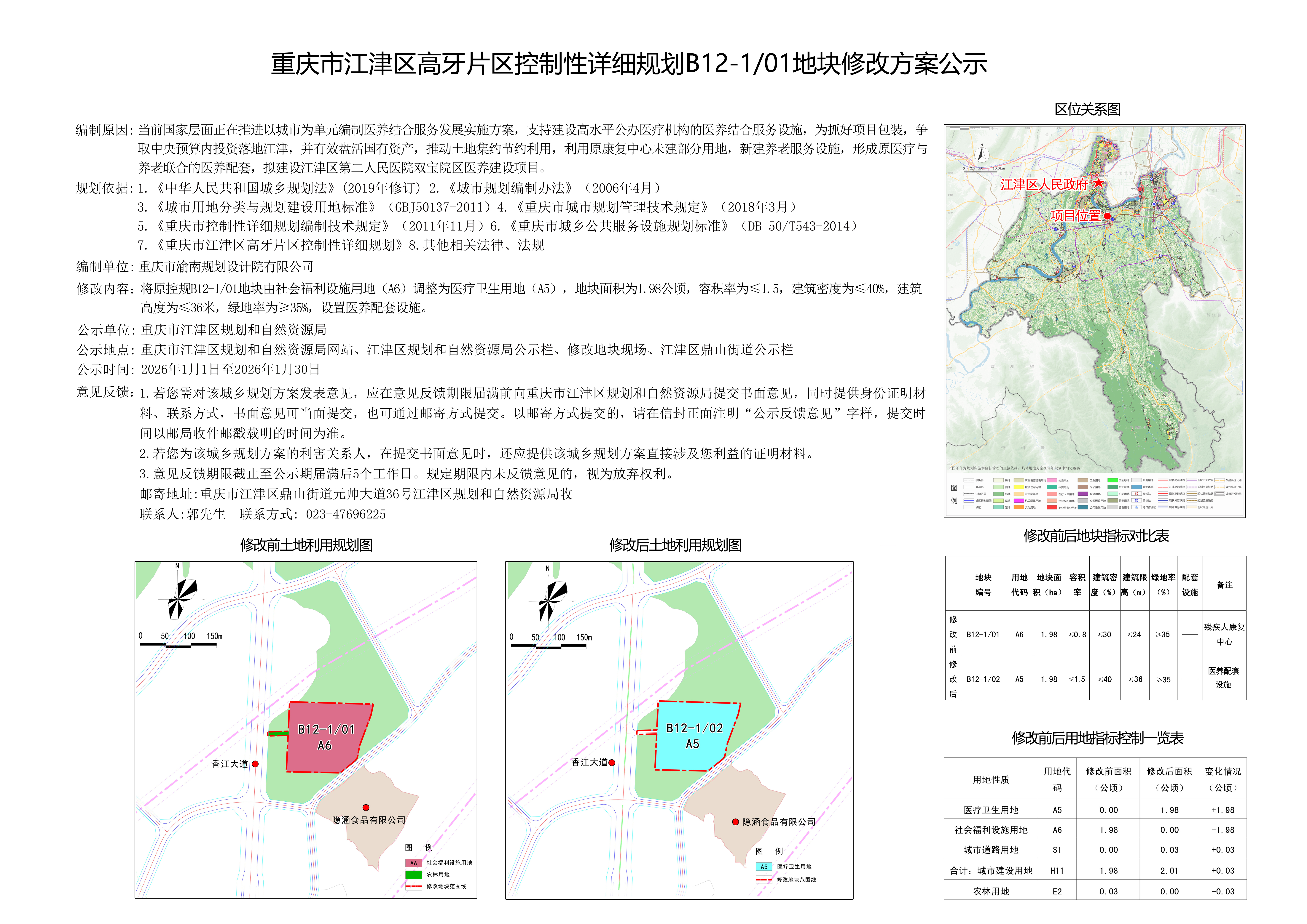 重庆市江津区高压片区控制性详细规划B12-1/01地块规划修改方案公示