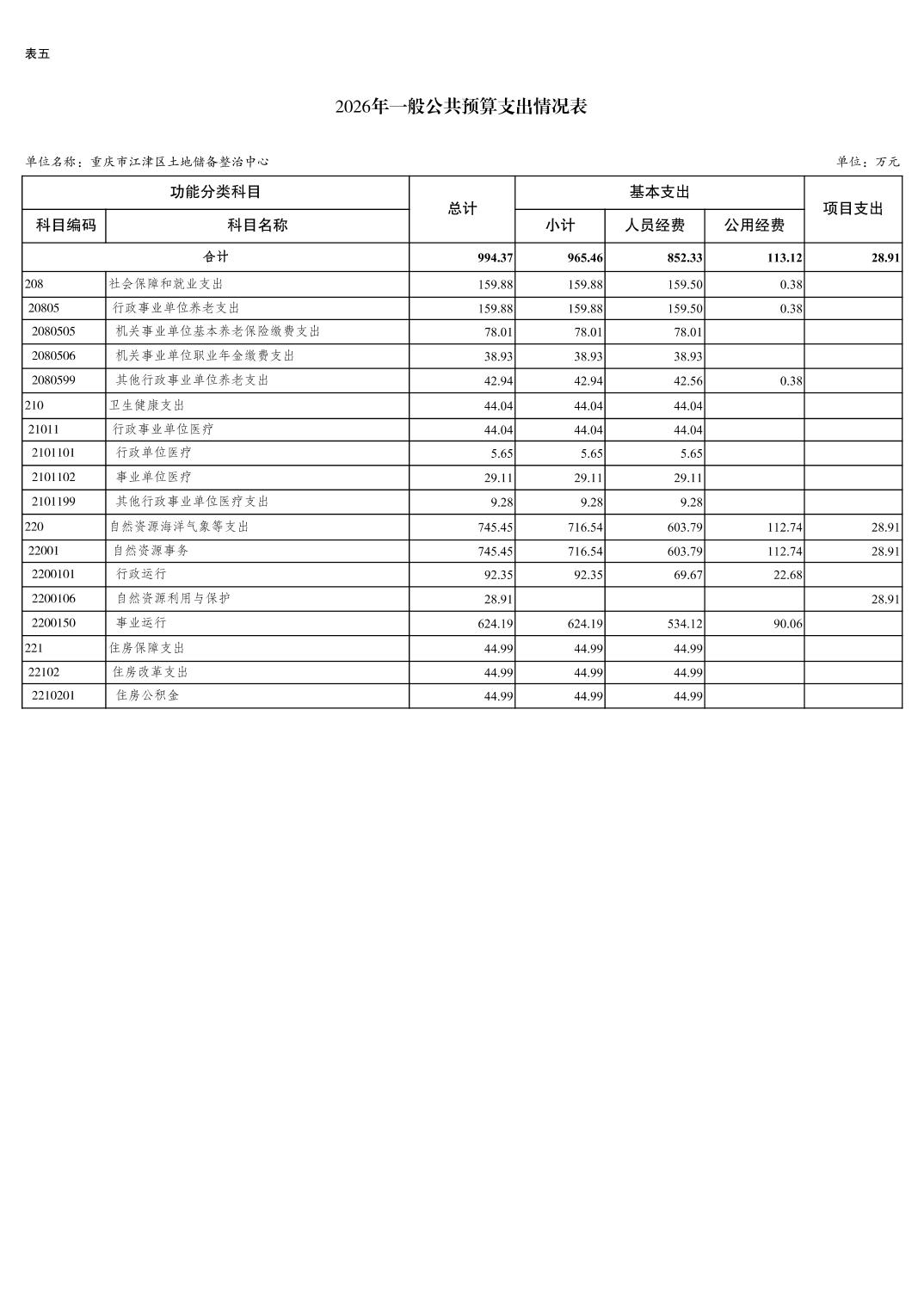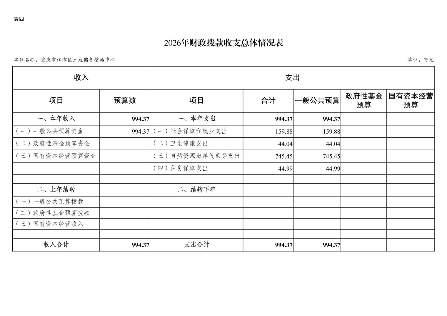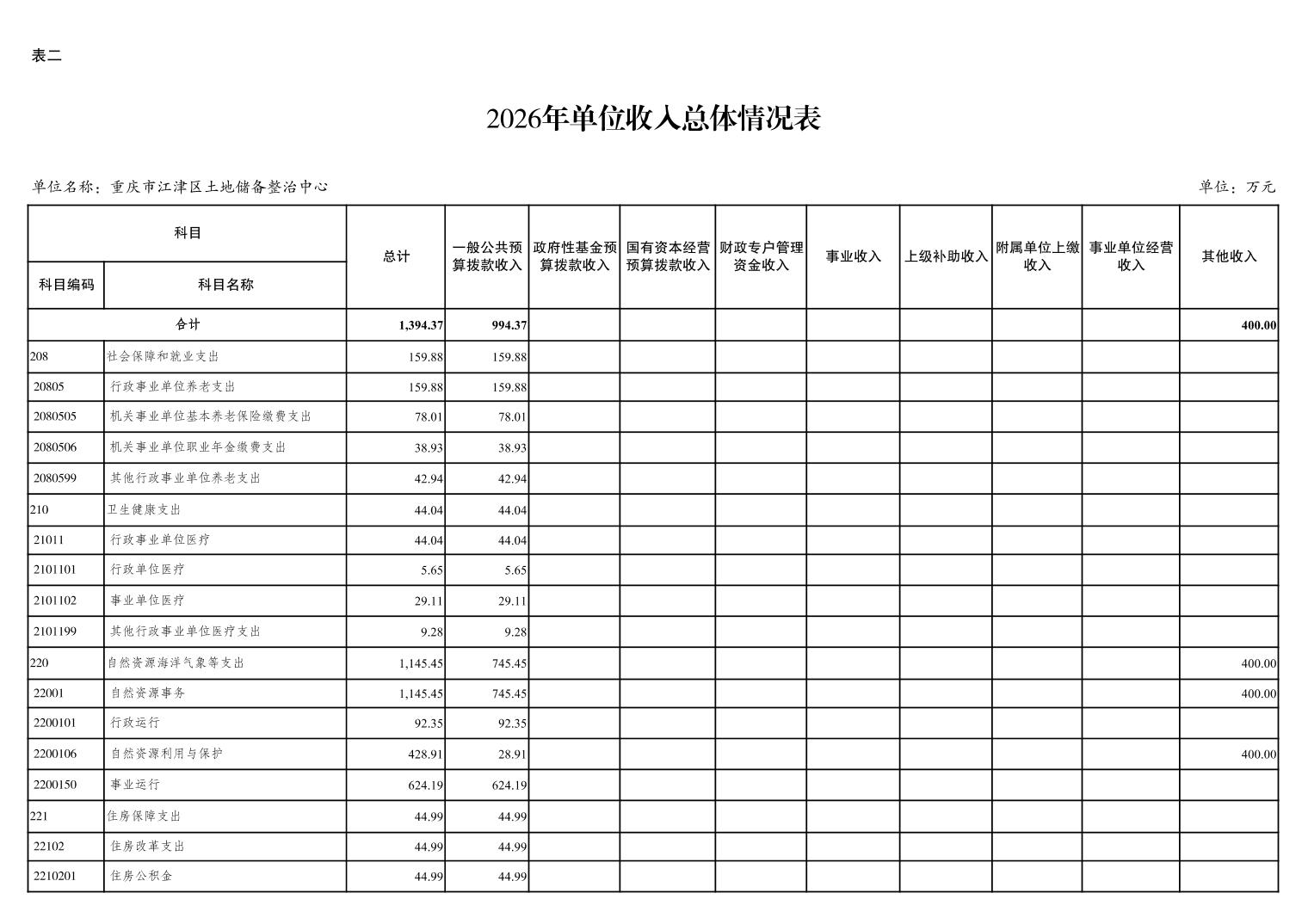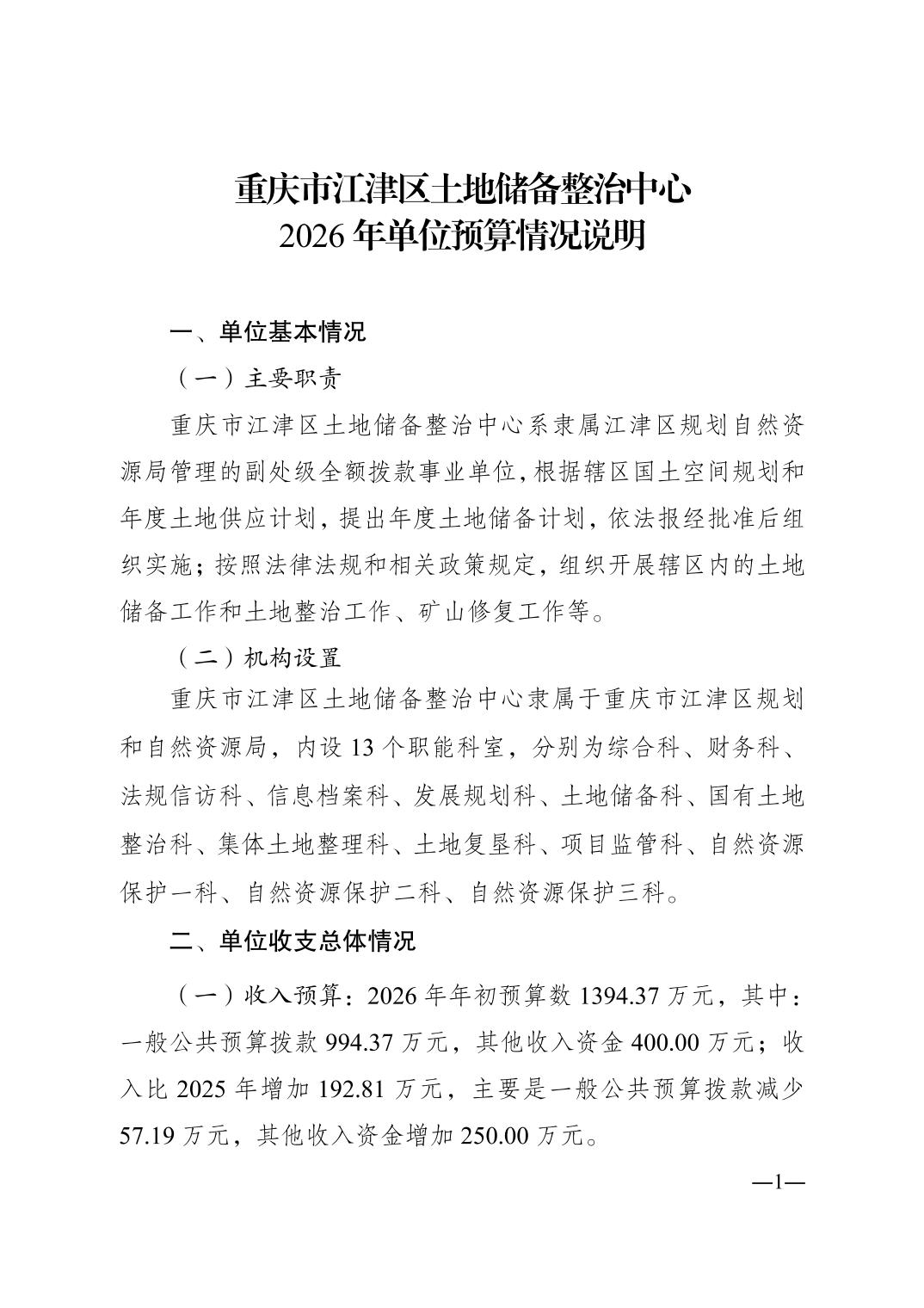 重庆市江津区土地储备整治中心2026 年单位预算情况说明
