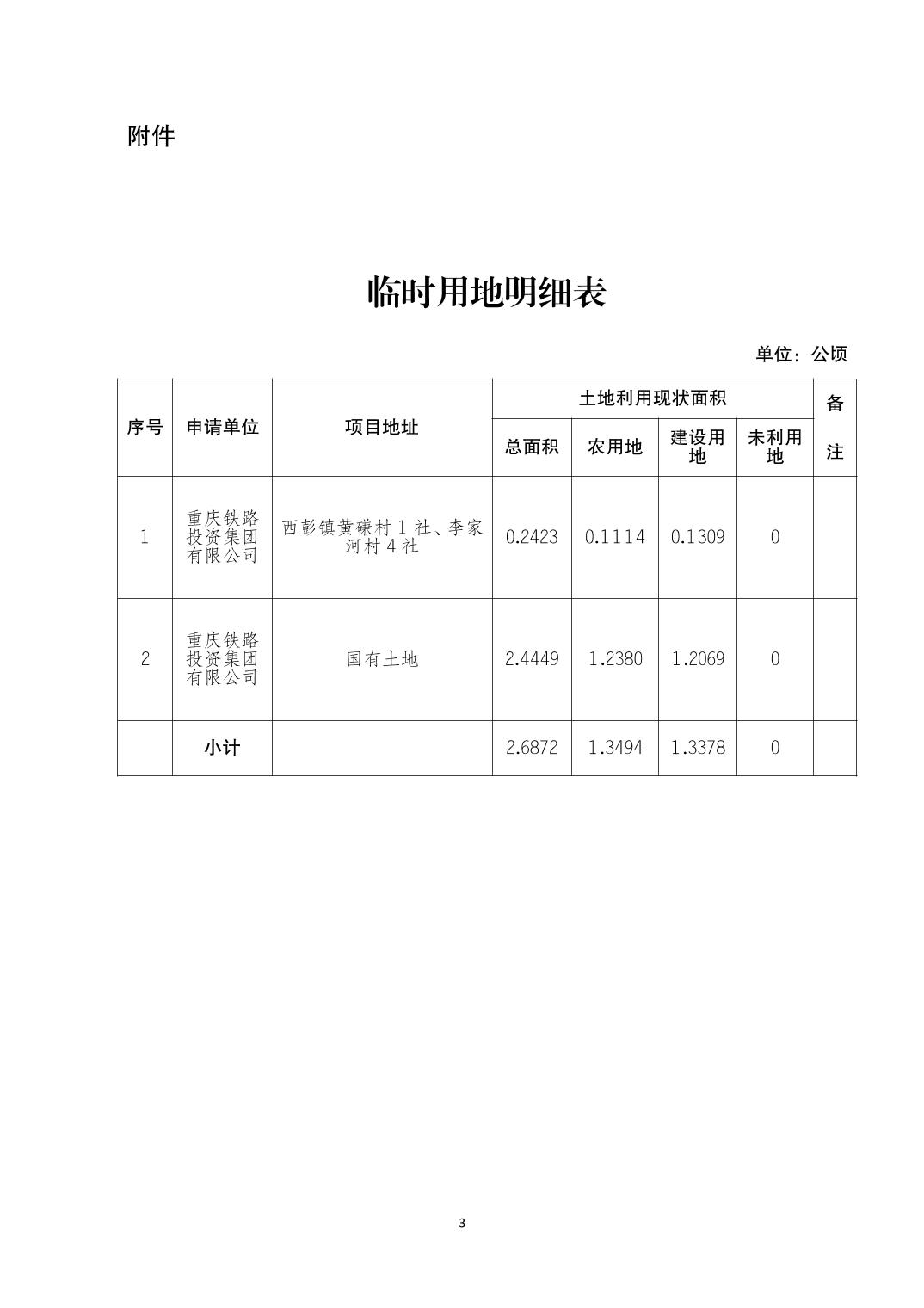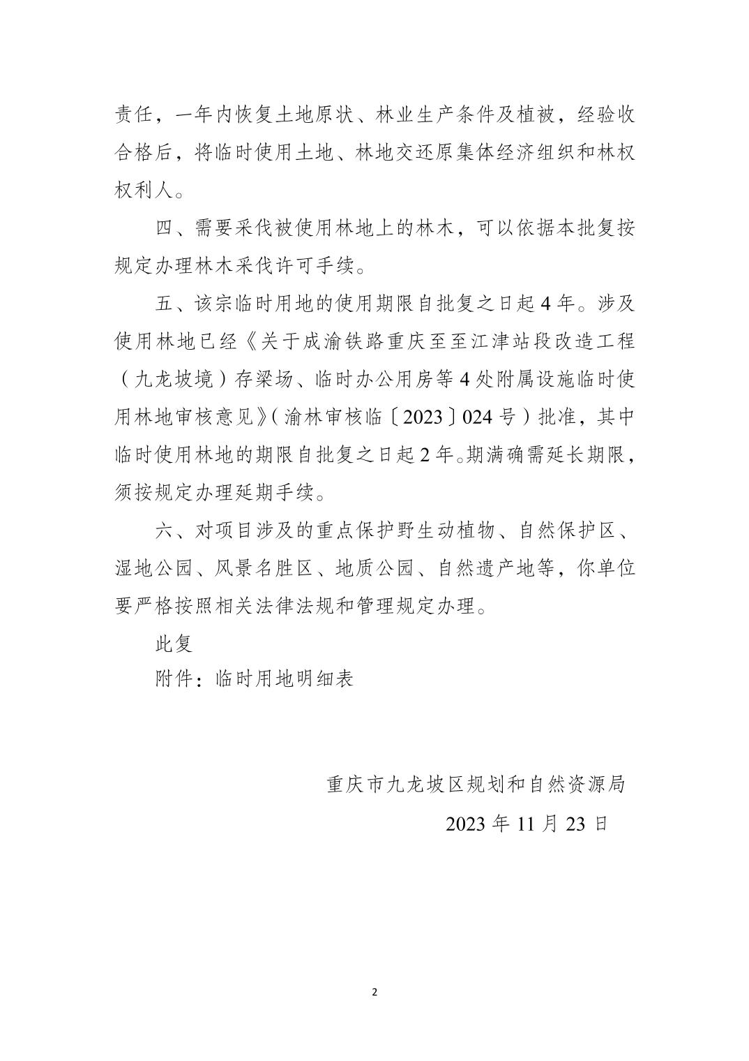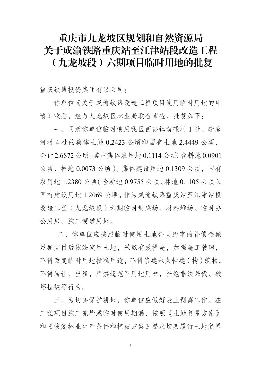 关于成渝铁路重庆站至江津站段改造工程(九龙坡段)六期项目临时用地的批复