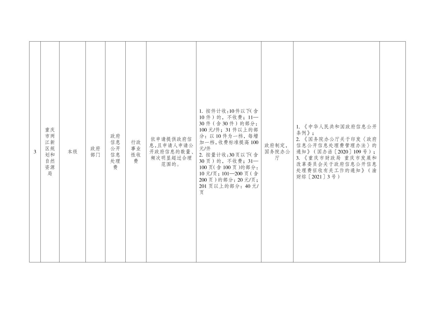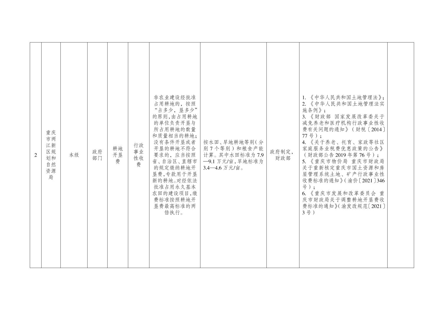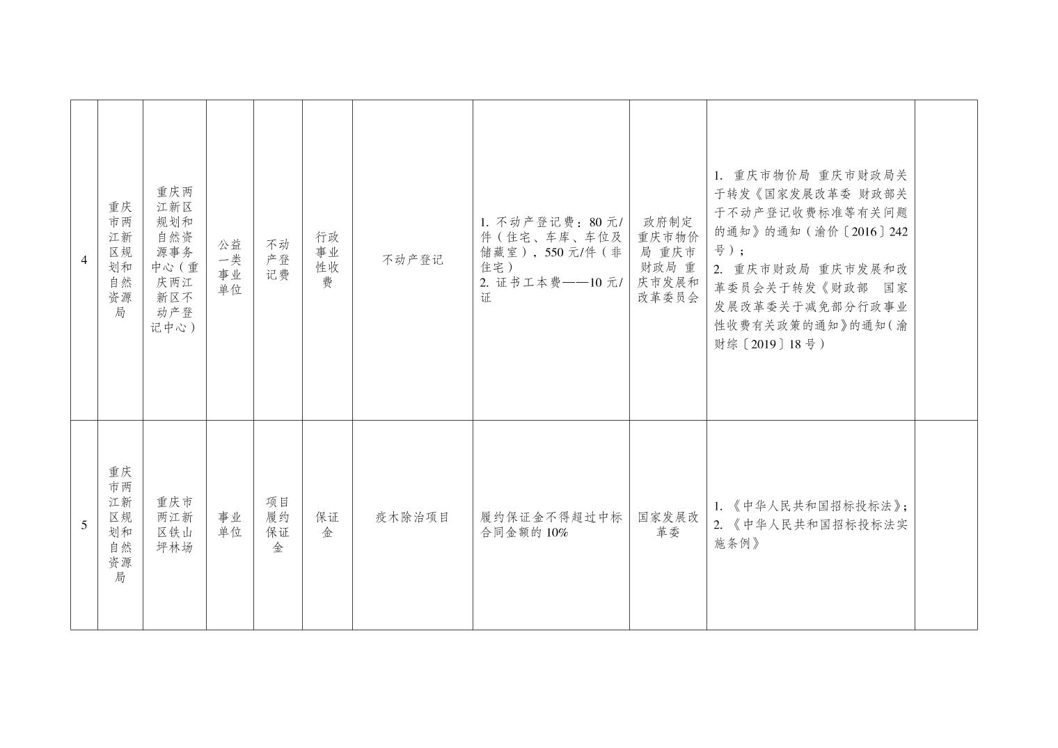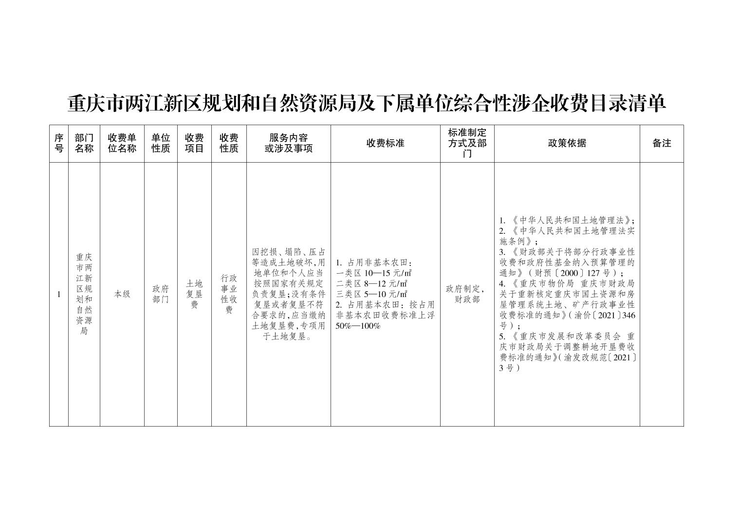 重庆市两江新区规划和自然资源局及下属单位综合性涉企收费目录清单