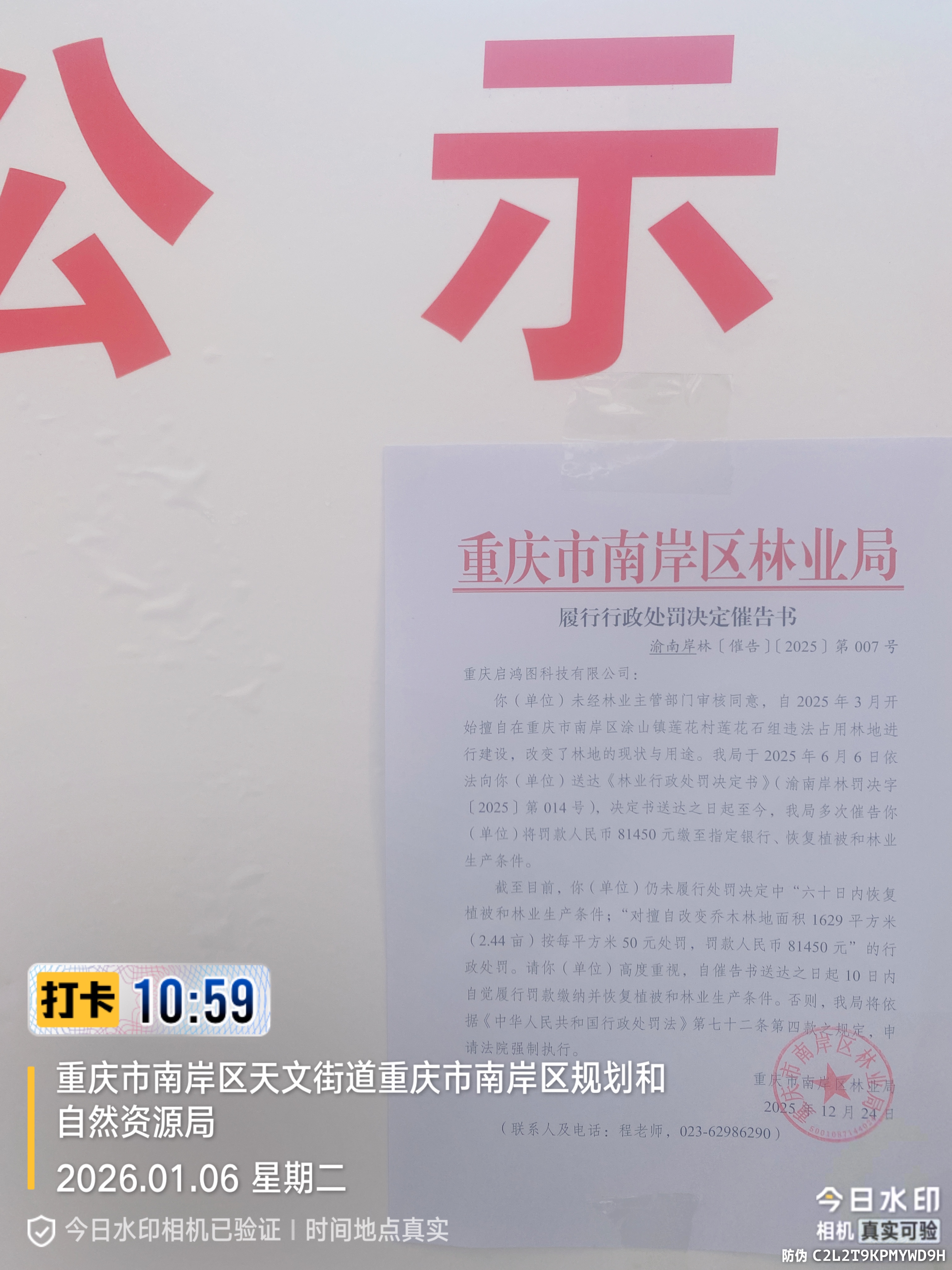 你(单位)未经林业主管部门审核同意,自2025年3月开始擅自在重庆市南岸区涂山镇莲花村莲花石组违法占用林地进行建设,改变了林地的现状与用途。我局于2025年6月6日依法向你(单位)送达《林业行政处罚决定书》(渝南岸林罚决字〔2025〕第014号),决定书送达之日起至今,我局多次催告你(单位)将罚款人民币81450元缴至指定银行、恢复植被和林业生产条件。