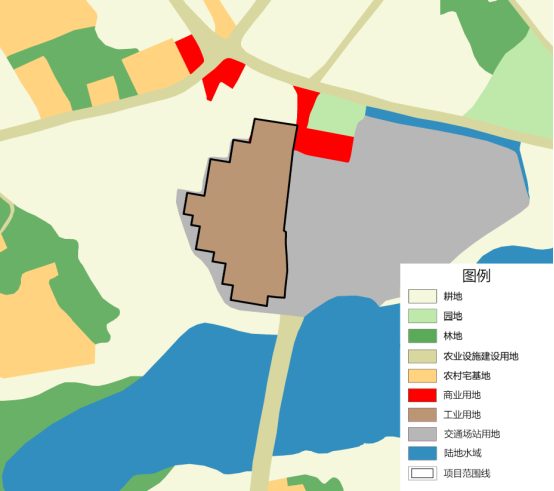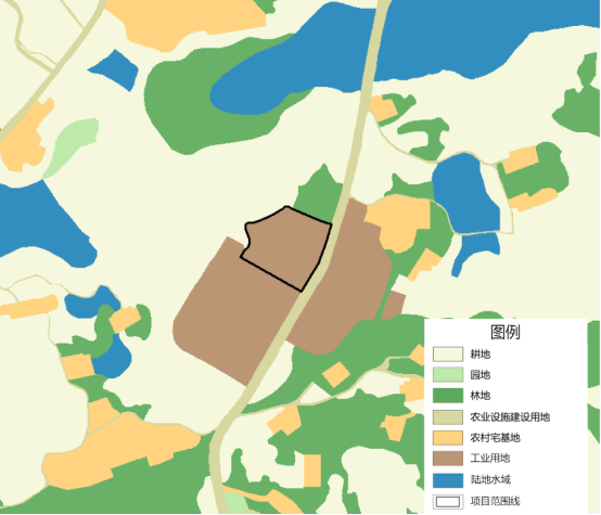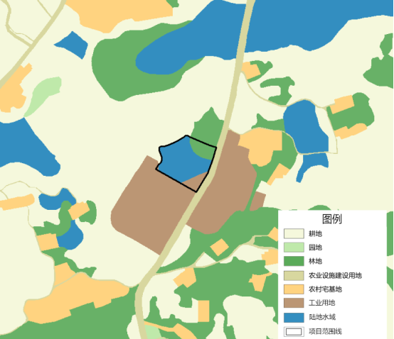 根据2023年国土变更调查数据,项目范围面积0.38公顷,其中林地0.06公顷,坑塘水面0.27公顷,工业用地0.05公顷。