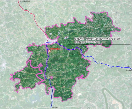 荣昌区古昌镇万吨泡菜加工项目面积0.38公顷,选址位于古昌镇冲锋村二社,距离古昌镇镇政府约1KM。