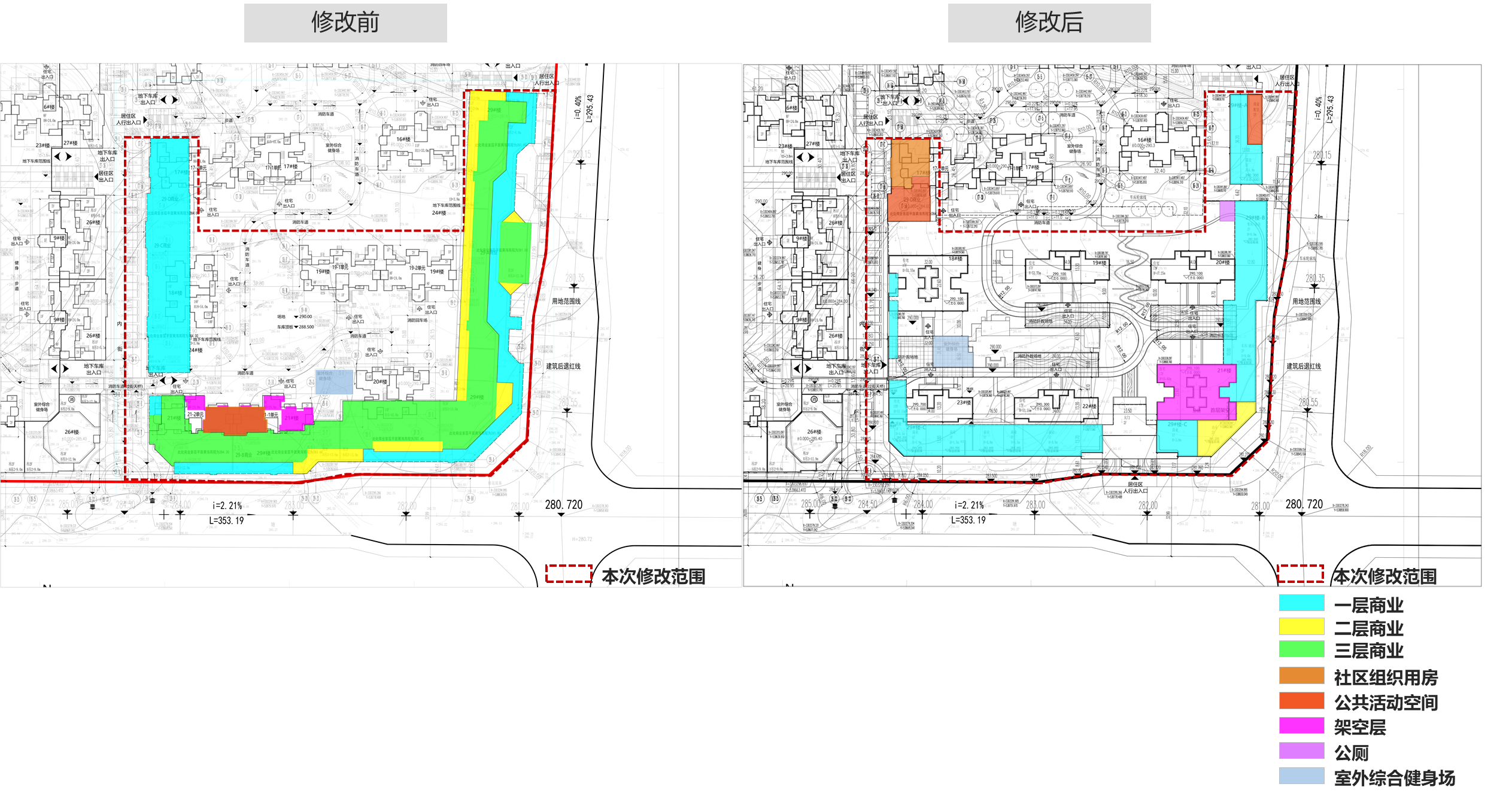 ①社区组织用房:原方案由小区内部21#楼二层调整到内街29#-D号楼,建筑面积由217㎡调整为269㎡,增加52㎡。