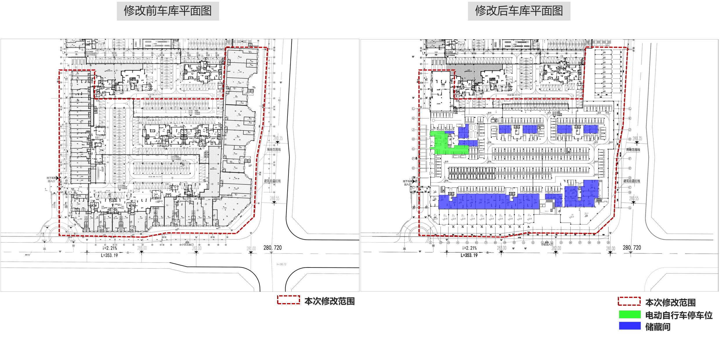 二期未建部分方案修改后,项目商住比由30%调整为22.72%,商业及居住总计容面积保持不变,增加社区组织用房建筑面积约52㎡、增设公共活动空间建筑面积约261㎡、增设公共厕所建筑面积约50㎡、增加机动车停车位87个、增设电动自行车停车位约53个、增加二期小区人行出入口。