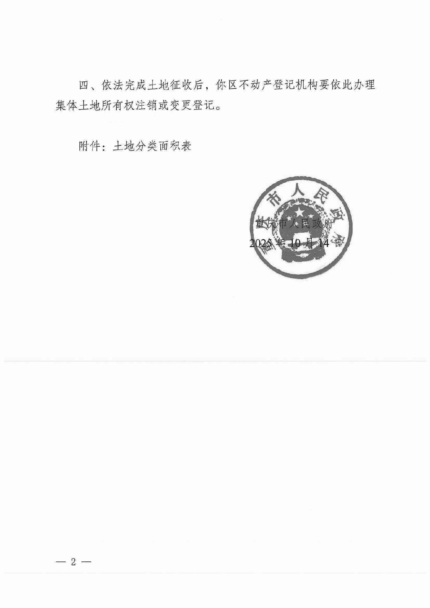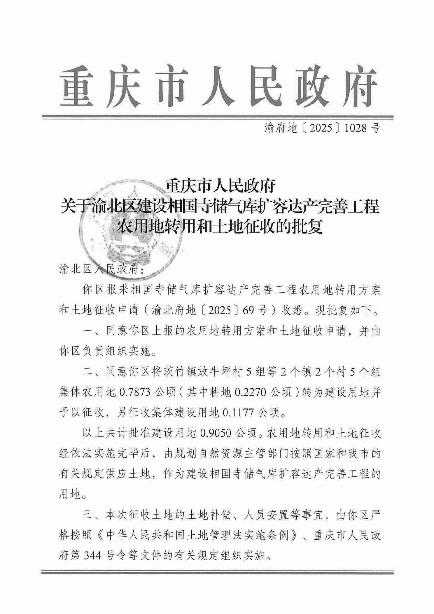 重庆市人民政府关于渝北区建设相国寺储气库扩容达产完善工程农用地转用和土地征收的批复
