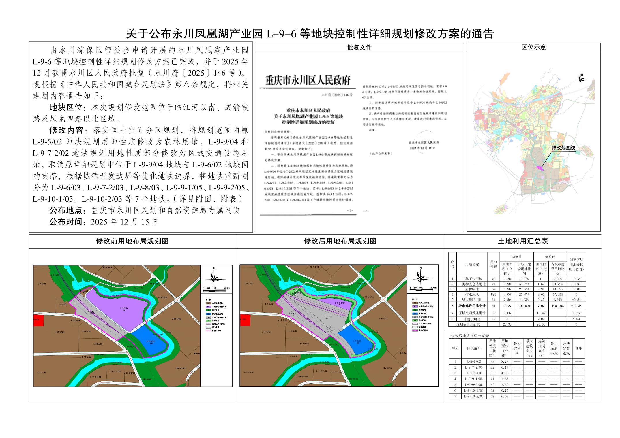 关于公布永川凤凰湖产业园L-9-6等地块控制性详细规划修改方案的通告
