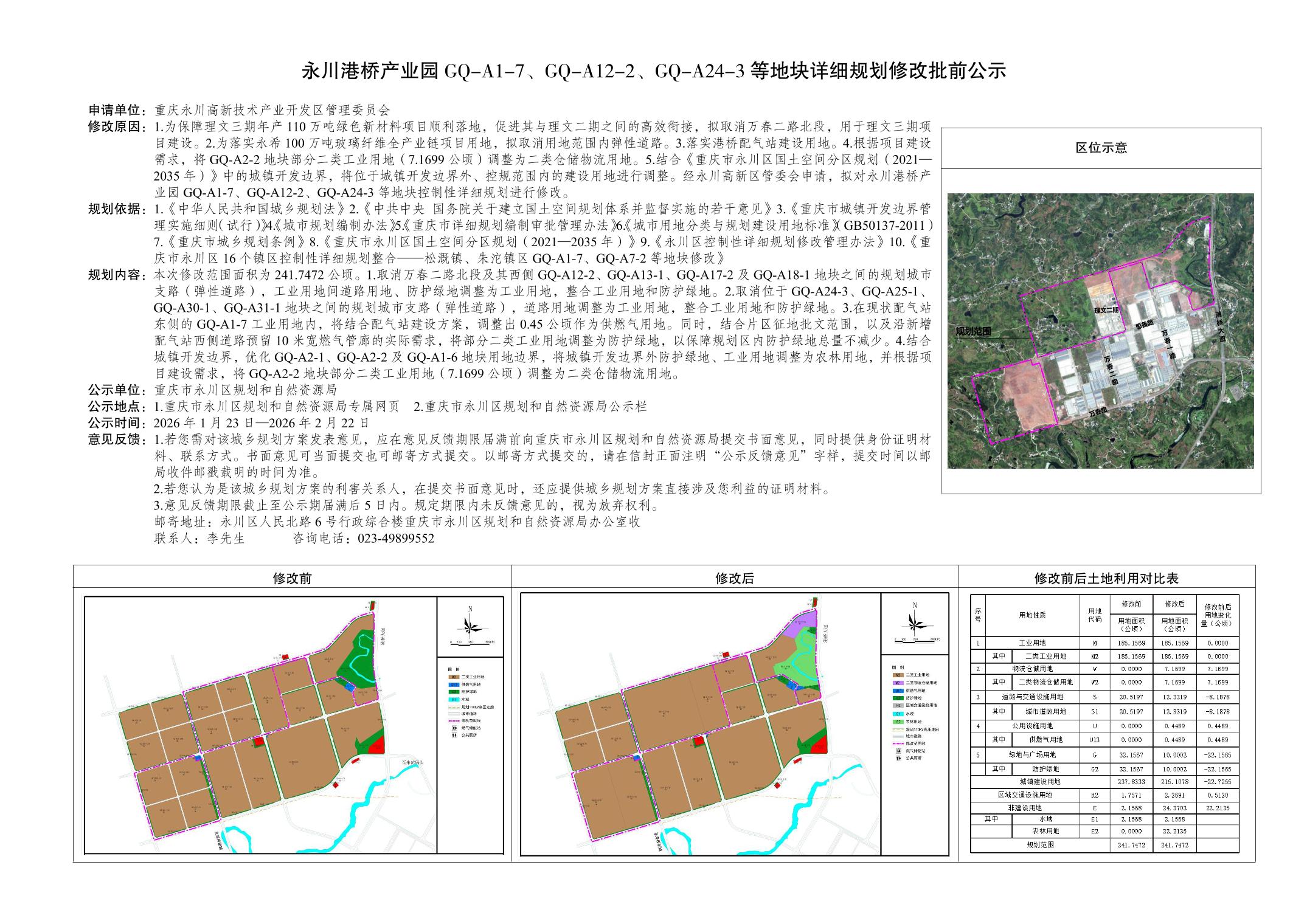 永川港桥产业园GQ-A1-7、GQ-A12-2、GQ-A24-3等地块详细规划修改批前公示