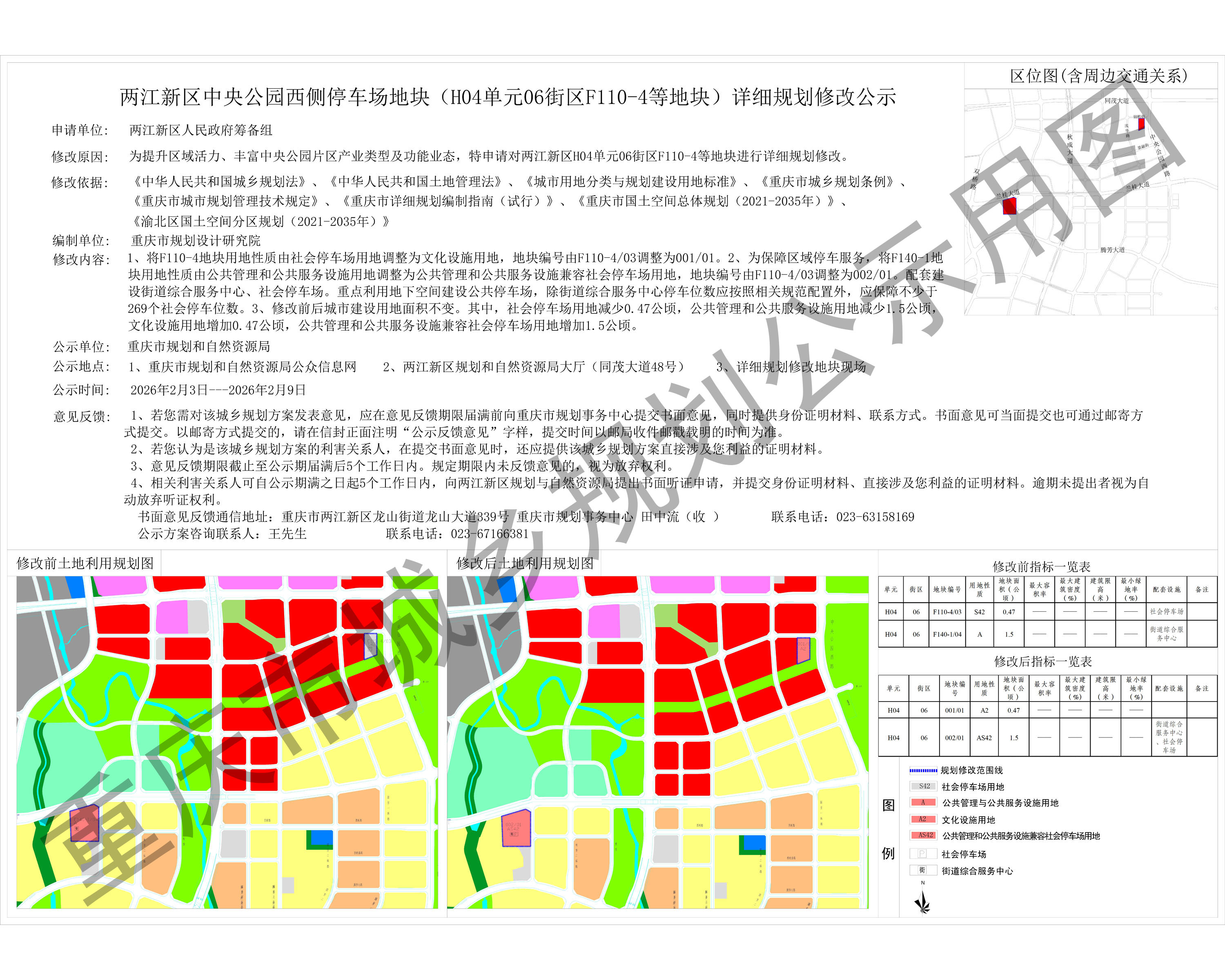两江新区中央公园西侧停车场地块(H04单元06街区F110-4等地块)详细规划修改公示