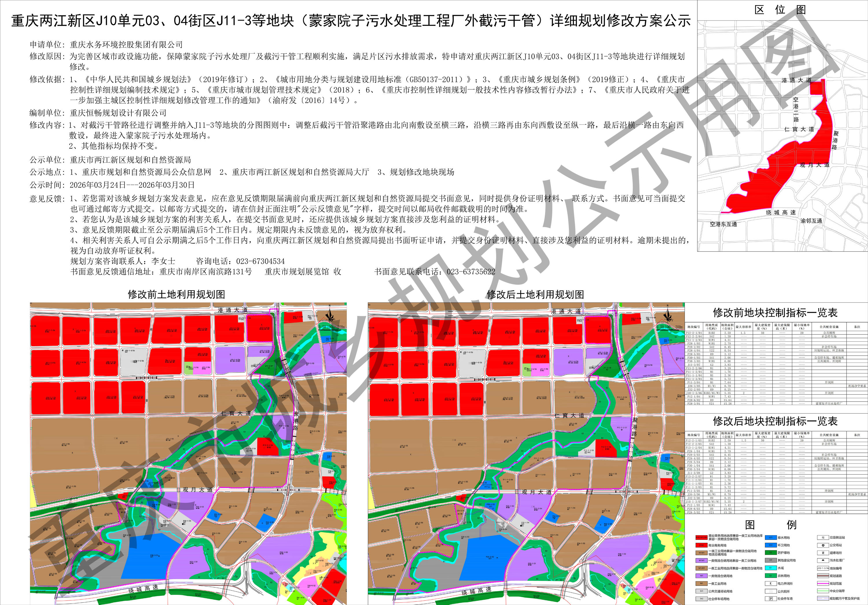 重庆两江新区J10单元03、04街区J11-3等地块(蒙家院子污水处理工程厂外截污干管)详细规划修改方案公示