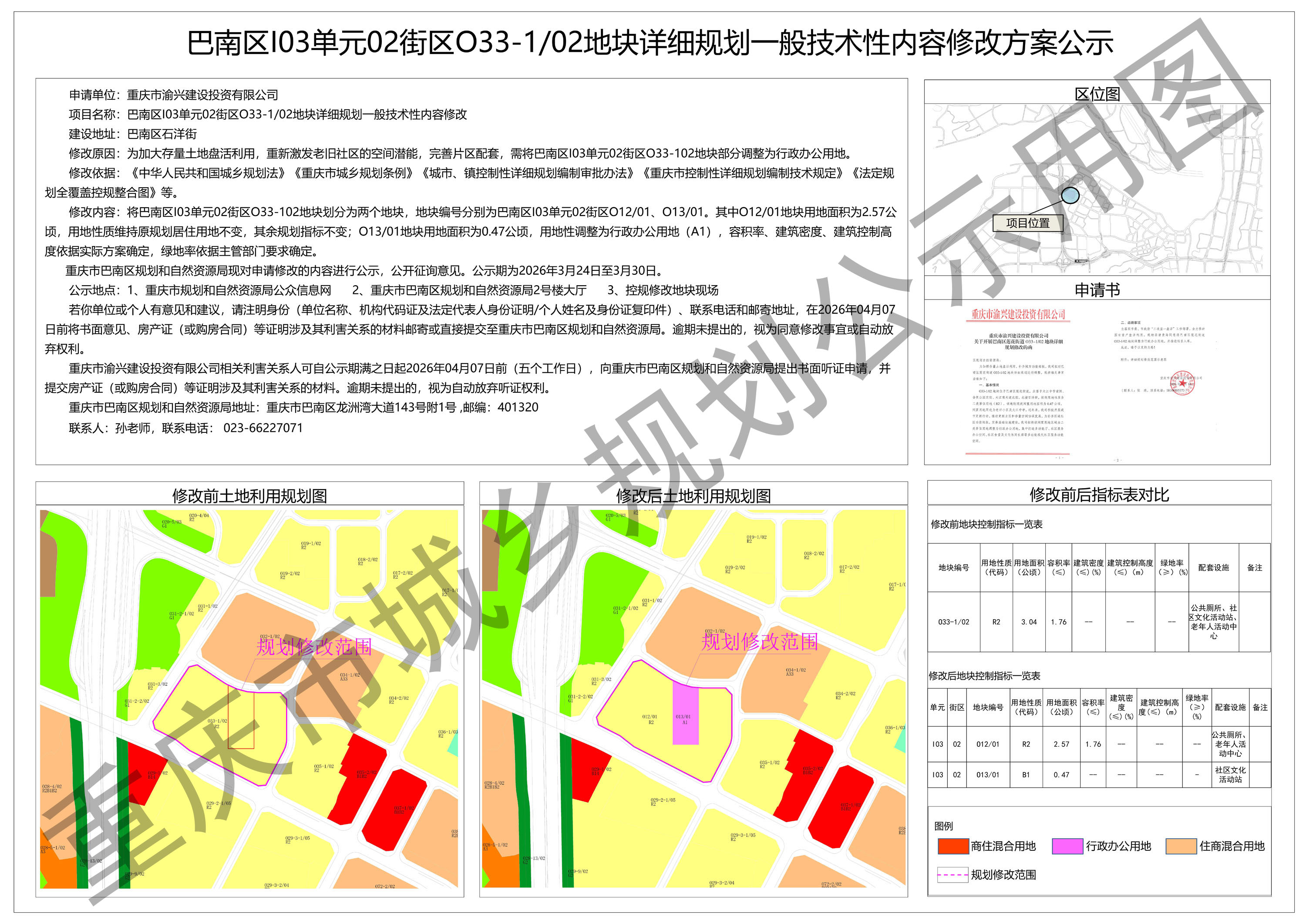 巴南区I03单元02街区O33-1/02地块详细规划一般技术性内容修改方案公示