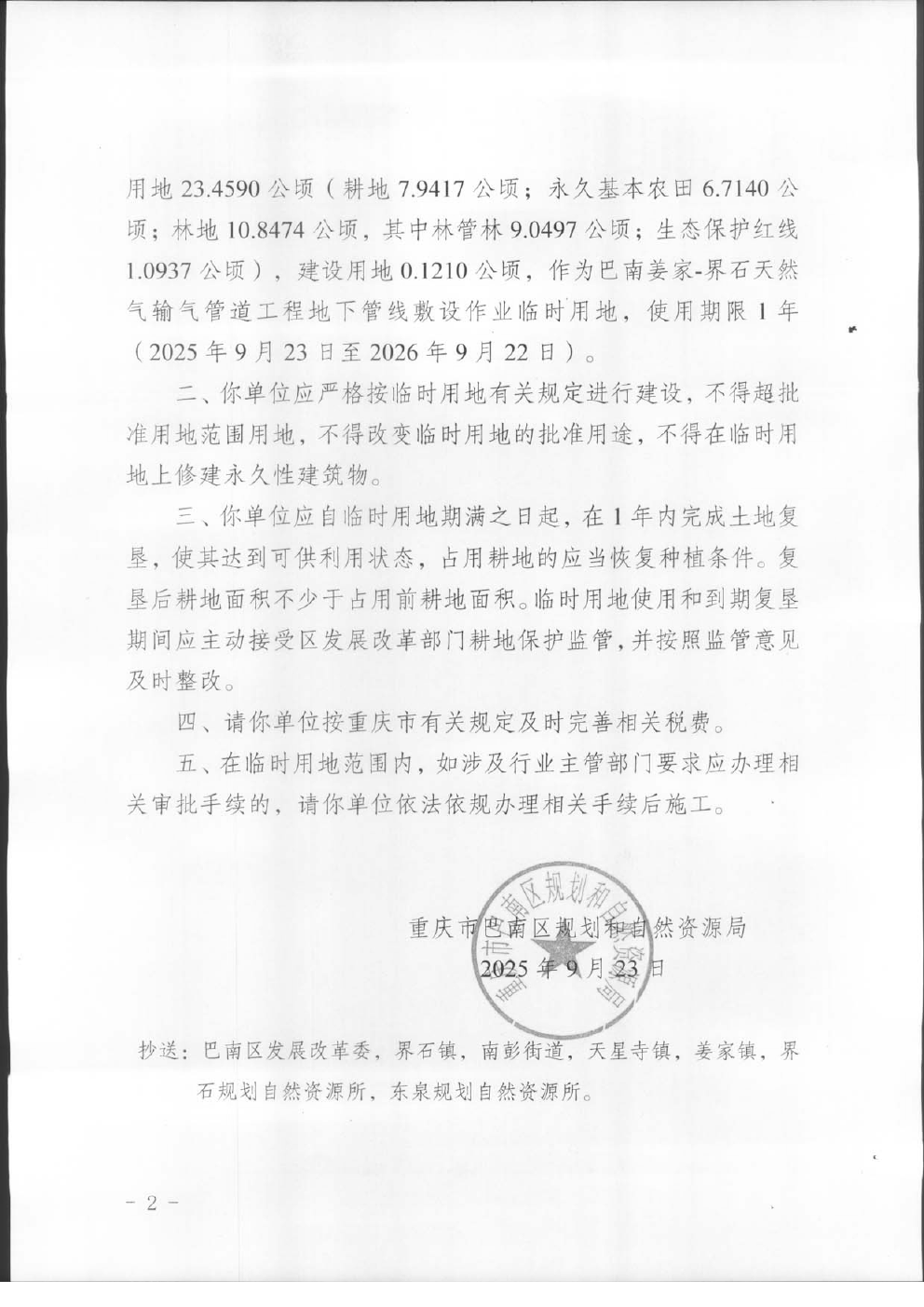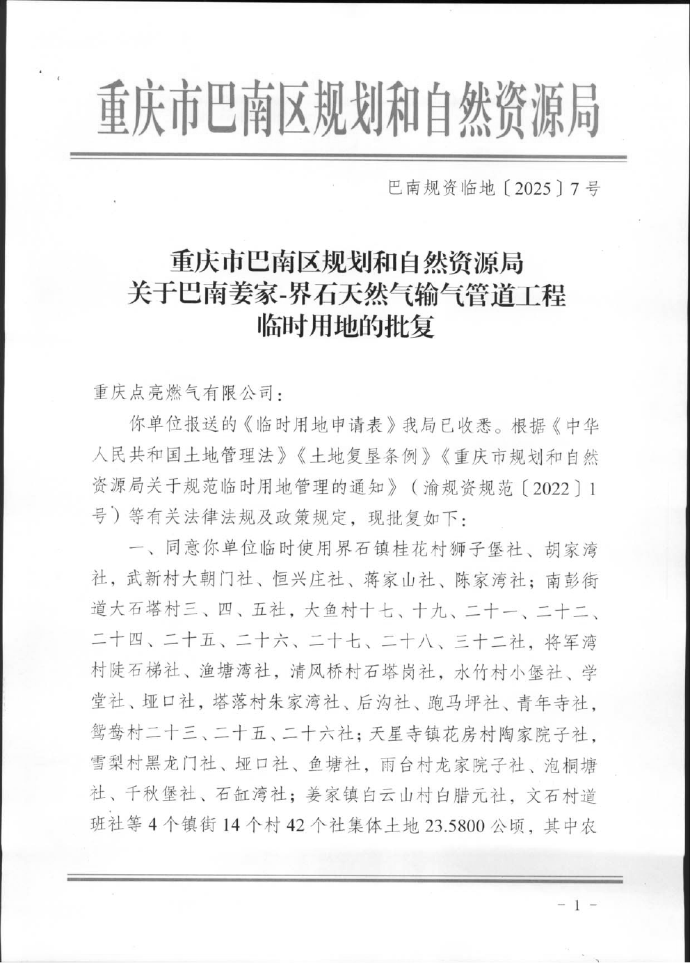 关于巴南姜家-界石天然气输气管道工程临时用地的批复-巴南规资临地〔2025〕7号