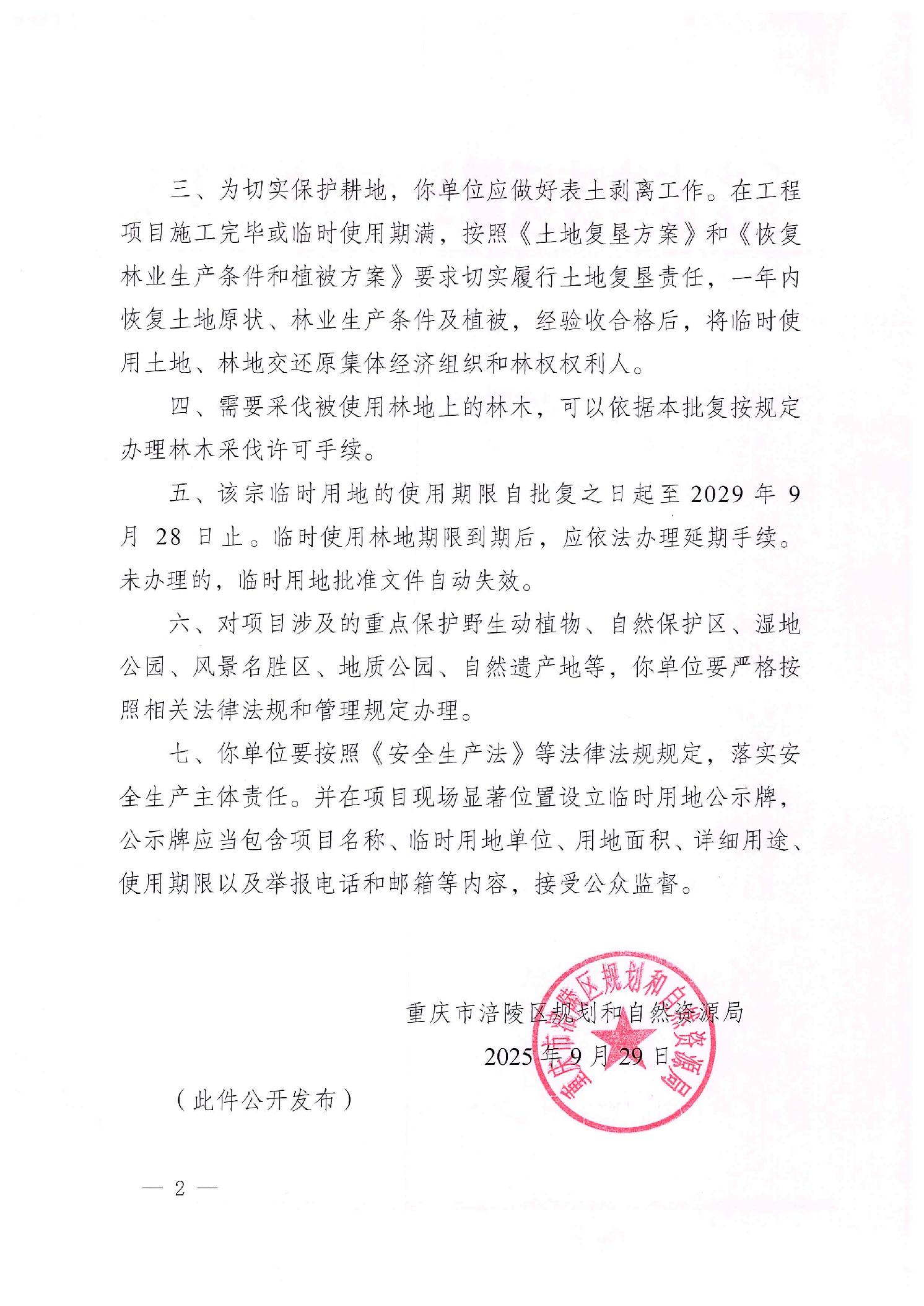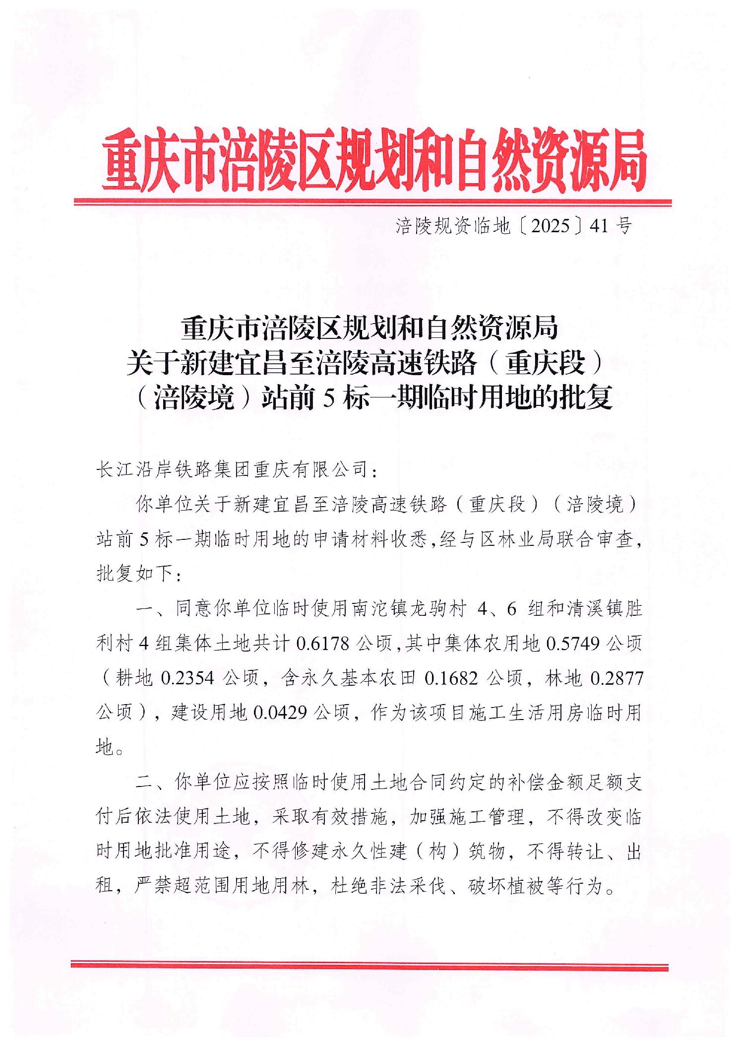 重庆市涪陵区规划和自然资源局关于新建宜昌至涪陵高速铁路(重庆段)(涪陵境)站前5标一期临时用地的批复 涪陵规资临地〔2025〕41号