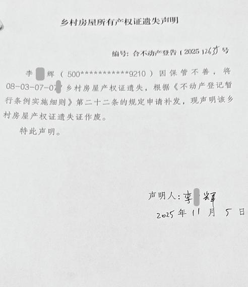 乡村房屋所有权证遗失声明编号:合不动产登告﹝2025﹞2635号