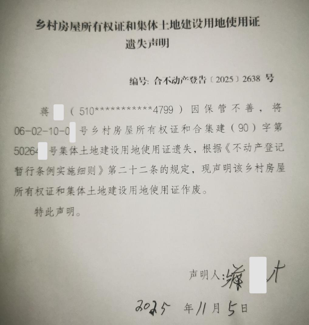 乡村房屋所有权证和集体土地建设用地使用证遗失声明编号:合不动产登告﹝2025﹞2638号