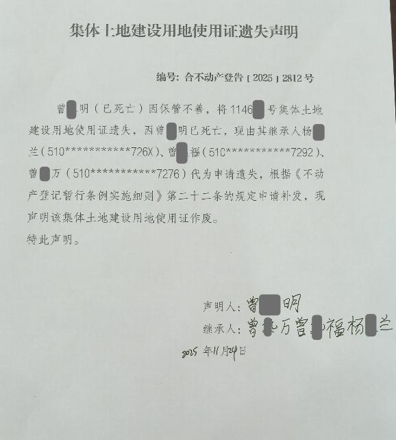 集体土地建设用地使用证遗失声明编号:合不动产登告﹝2025﹞2812号