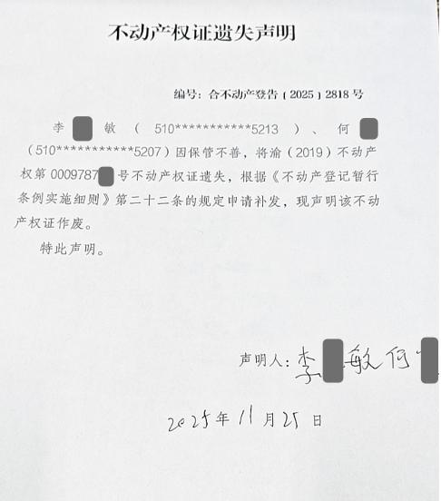 不动产权证遗失声明编号:合不动产登告﹝2025﹞2818号
